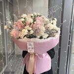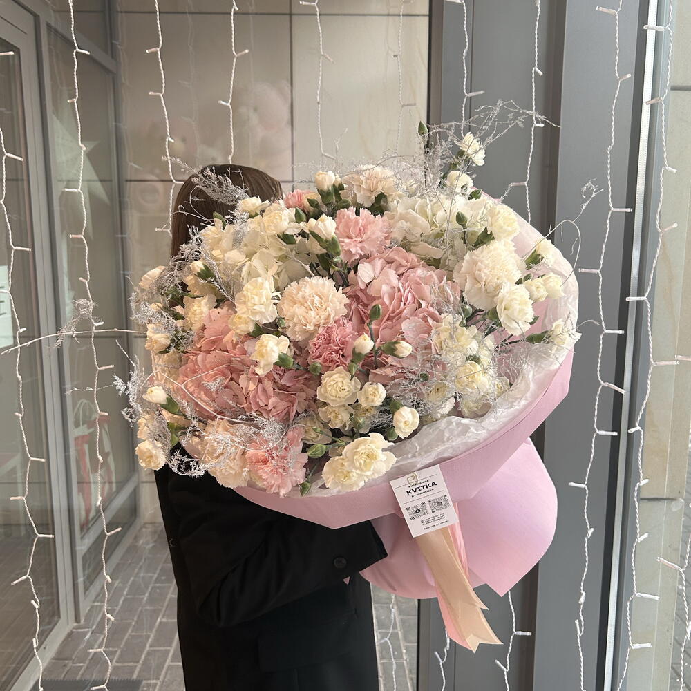 dianthus - 36 ud. asparagus - 5 ud. hortensja - 5 ud. papier dekoracyjny - 1 ud. akwabox - 1 ud.