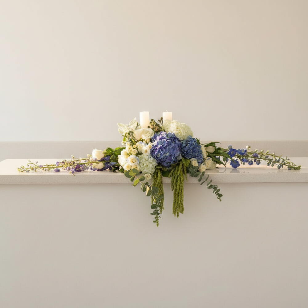 Decora tus espacios con sofisticación gracias a nuestro exclusivo Centro de Mesa Hortensias Elegantes, un arreglo floral premium diseñado con una armoniosa combinación de hortensias azules y blancas, rosas blancas frescas y eucalipto natural. Este diseño alargado es ideal para mesas de comedor, eventos especiales, bodas o celebraciones elegantes. Su estilo moderno y delicado lo posiciona como una excelente opción dentro de los centros de mesa florales en México, aportando frescura, elegancia y un toque natural a cualquier ambiente. Incluye velas decorativas que complementan perfectamente el arreglo, creando una atmósfera cálida y sofisticada.