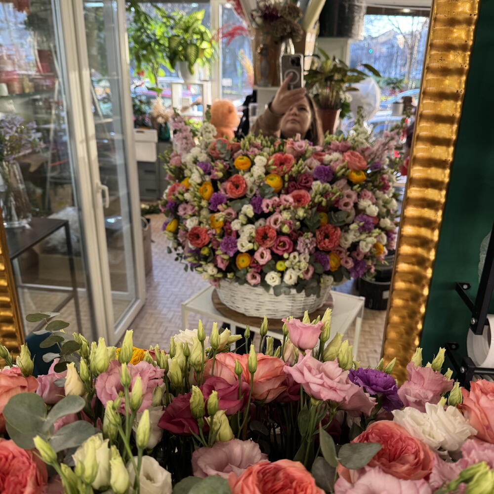 Eucalyptus - 25 ud. Lisianthus - 25 ud. garofani - 20 ud. expresión en rosa - 25 ud. violaciocca - 21 ud. ranuncoli gialli - 35 ud.