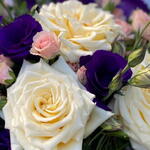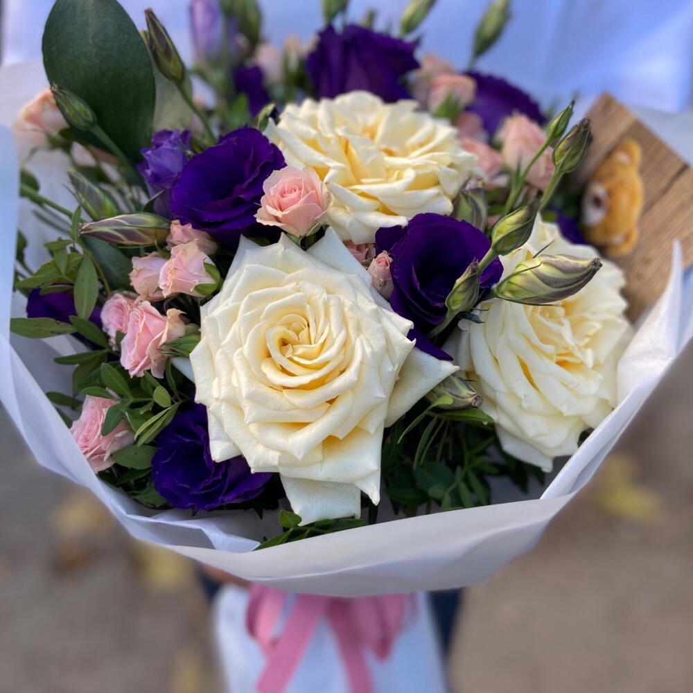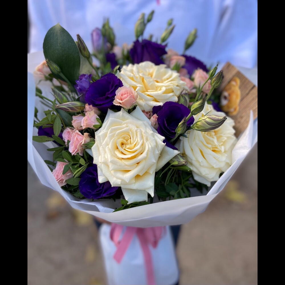 Писташ - 5 ud. Кустовая rosa - 4 ud. Эустома - 4 ud. Embalaje de diseño - 3 ud. Тишью blanco - 2 ud. rosas Ecuador - 3 ud.