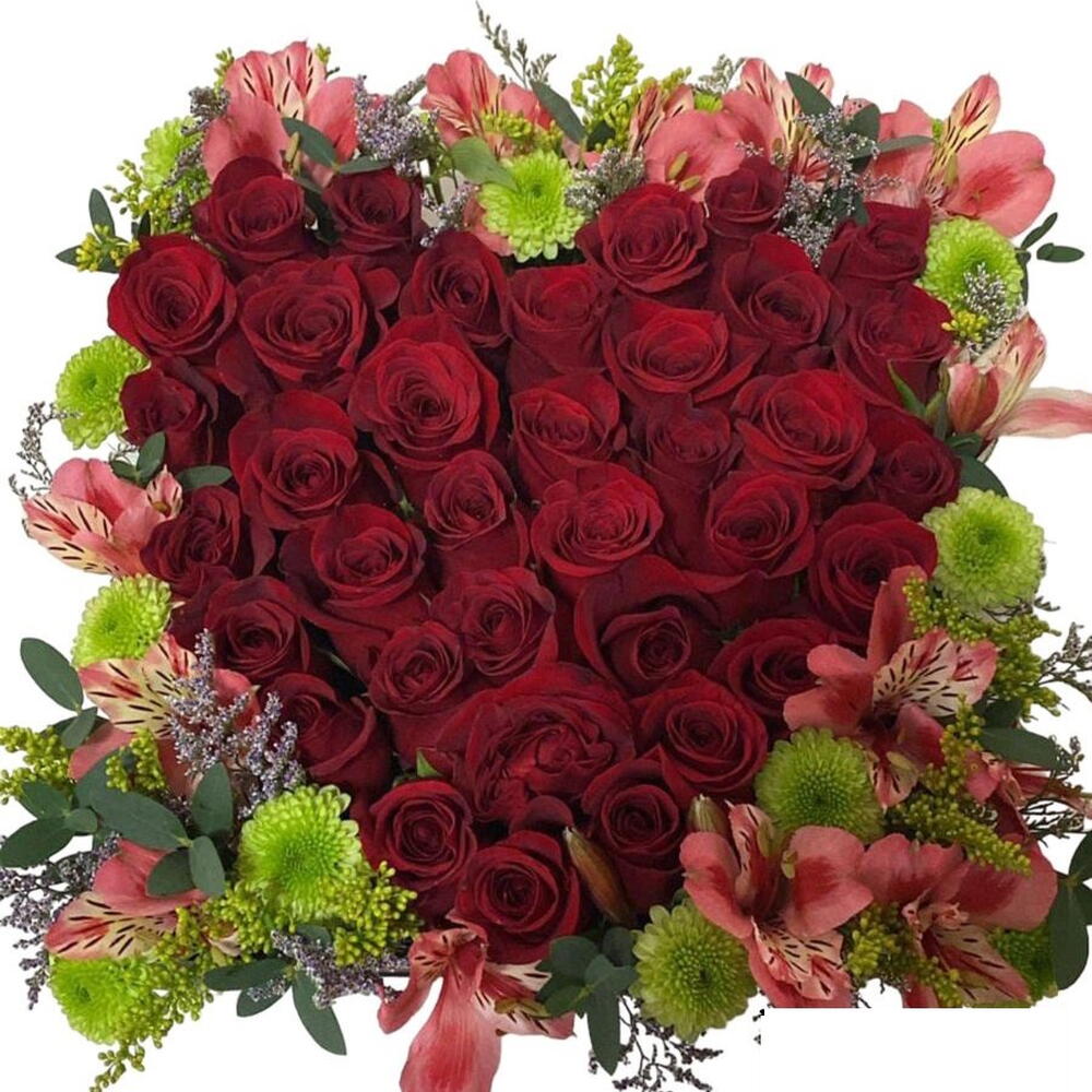 rosas rojas - 40 ud. base de madera - 1 ud. flors y folajes varios - 15 ud.