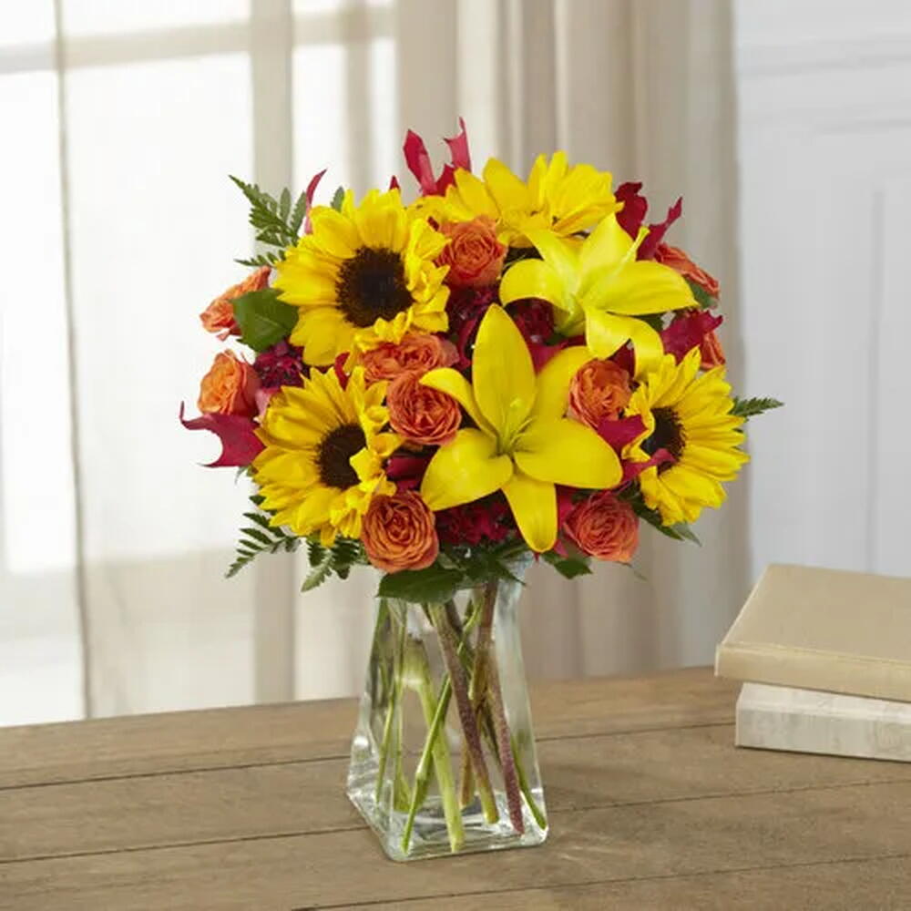 El Ramo de Flores de FTD Cosechas del Corazón llevará la belleza otoñal directo a su puerta. Inolvidables mini girasoles llamaran la atencion de inmediato al llegar rodeados de Lilies asiáticos, mini rosas color naranja y finos follajes de temporada, creando un espectacular arreglo de flores. Presentado en un florero de cristal de forma cuadrada, se acentua con hojas de roble artificiales, haciendo un ramo perfecto para celebrar un cumpleanos, enviar un agradecimiento, un deseo de recuperacion o como un detalle en este dia de Accion de Gracias.