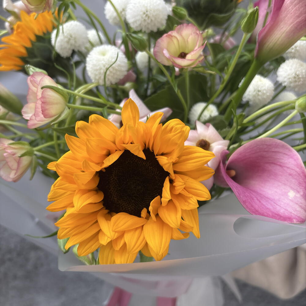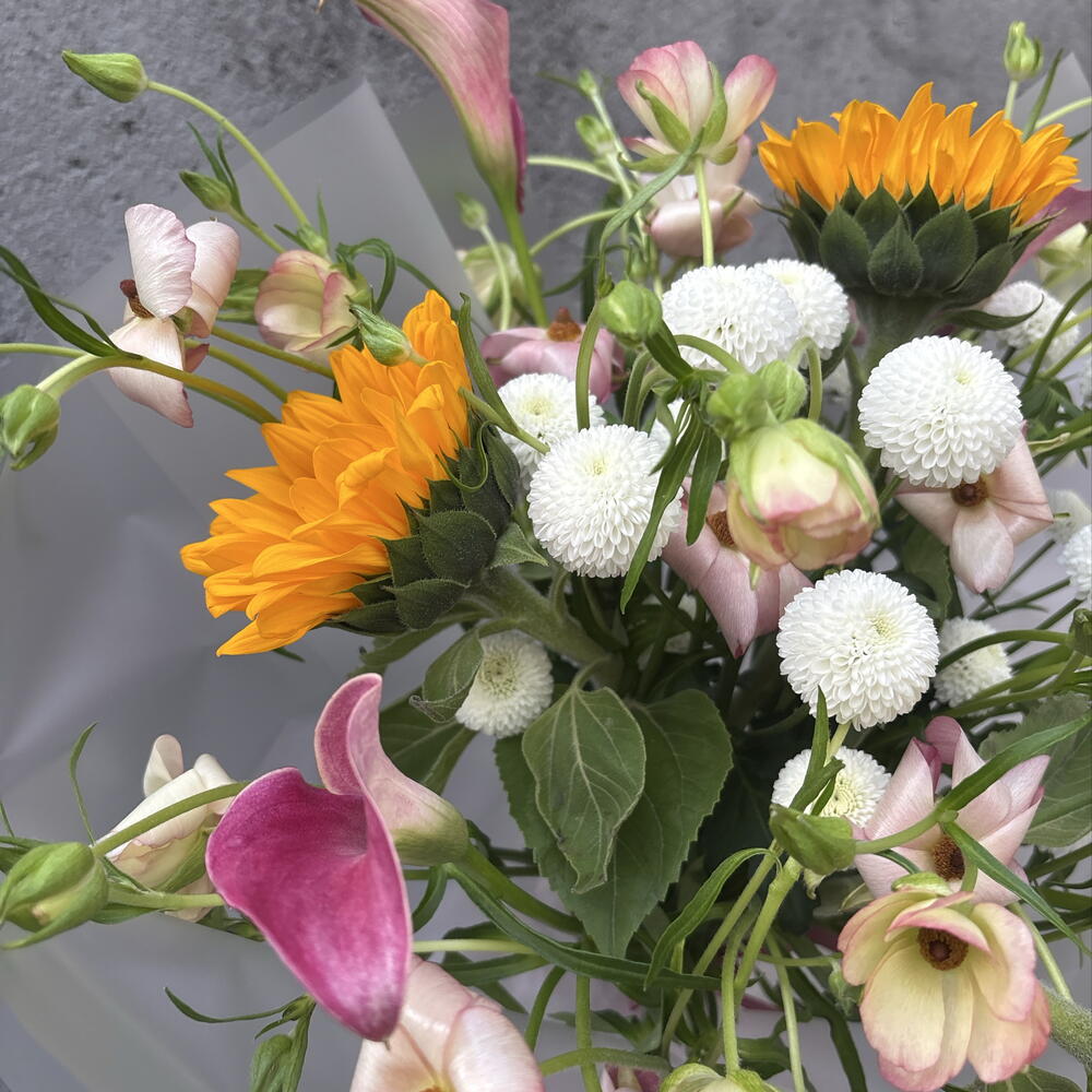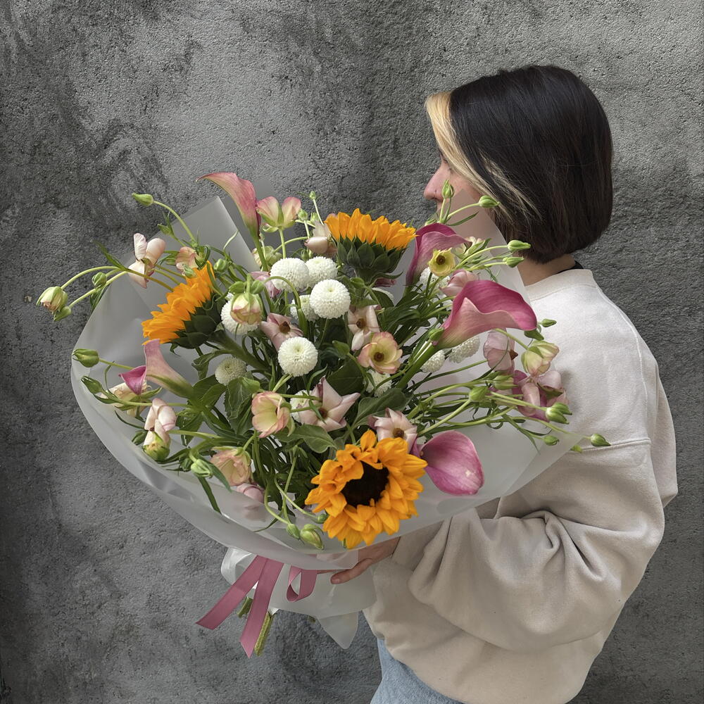 Calla - 6 ud. Crisantemo - 2 ud. La cinta - 2 ud. Sunflower - 3 ud. packing - 3 ud. ranunculus butterfly - 4 ud.