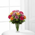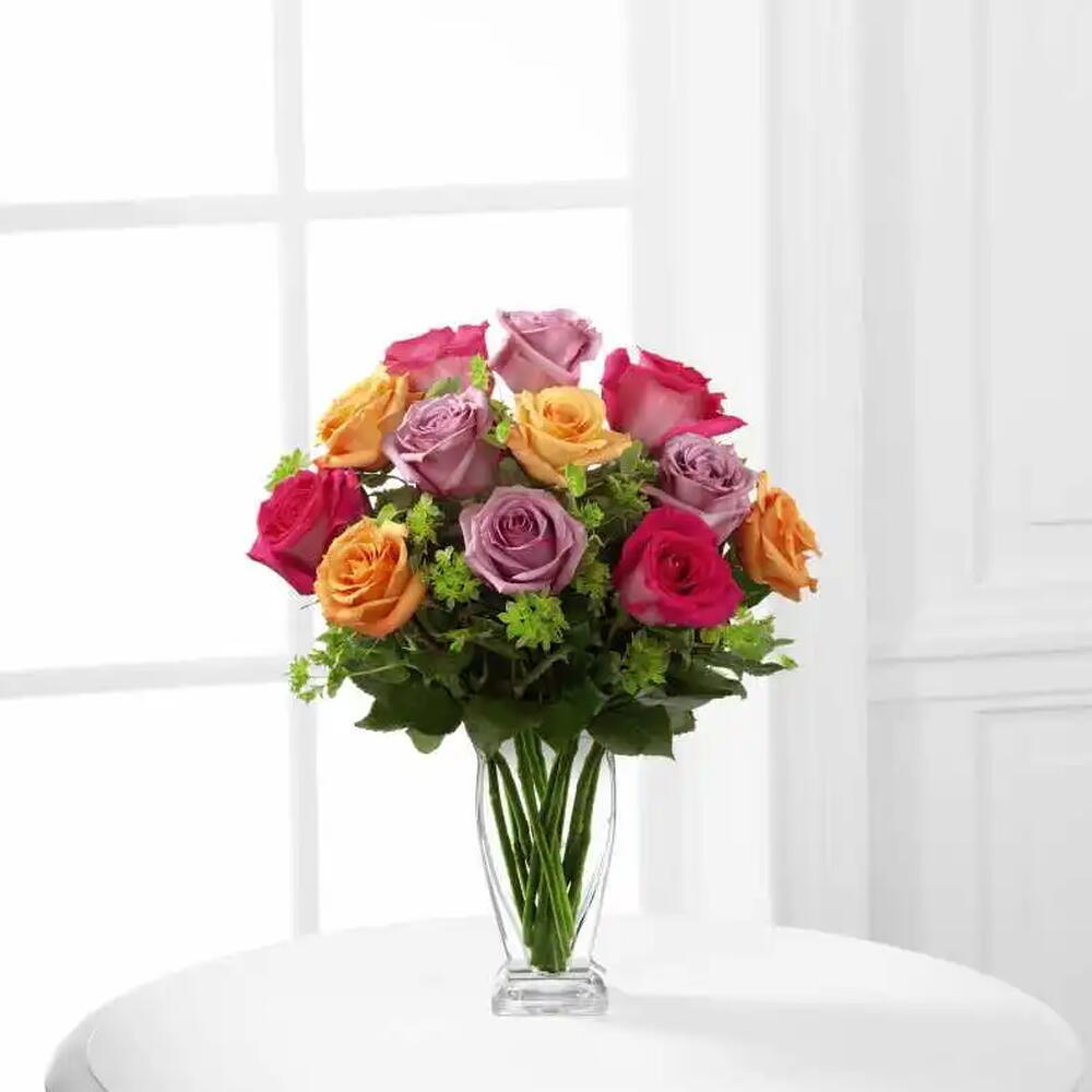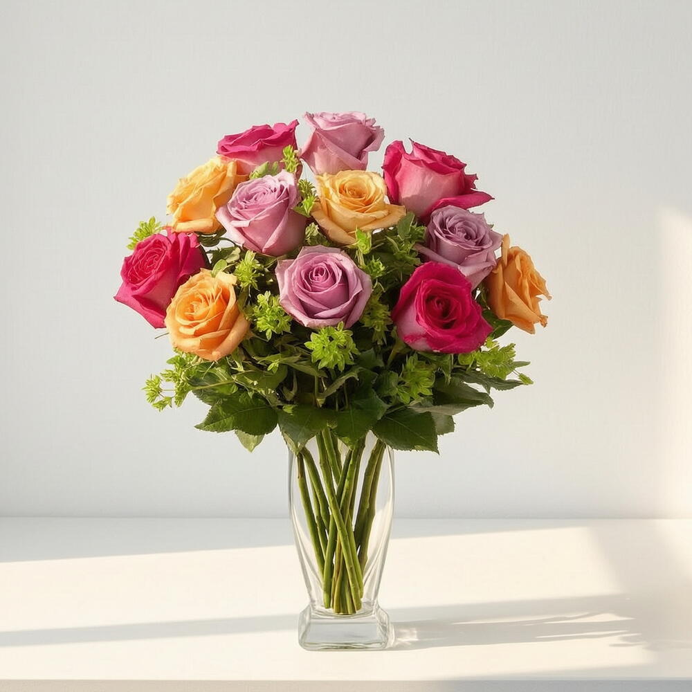 florero de cristal - 1 ud. rosas naranja - 4 ud. rosas lavanda - 4 ud. follaje seleccionado - 1 ud. rosas de intenso color rosado - 4 ud.