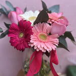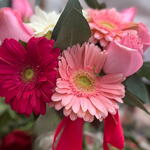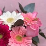 Gerbera - 4 ud. rosas - 5 ud. florero de cristal - 1 ud.