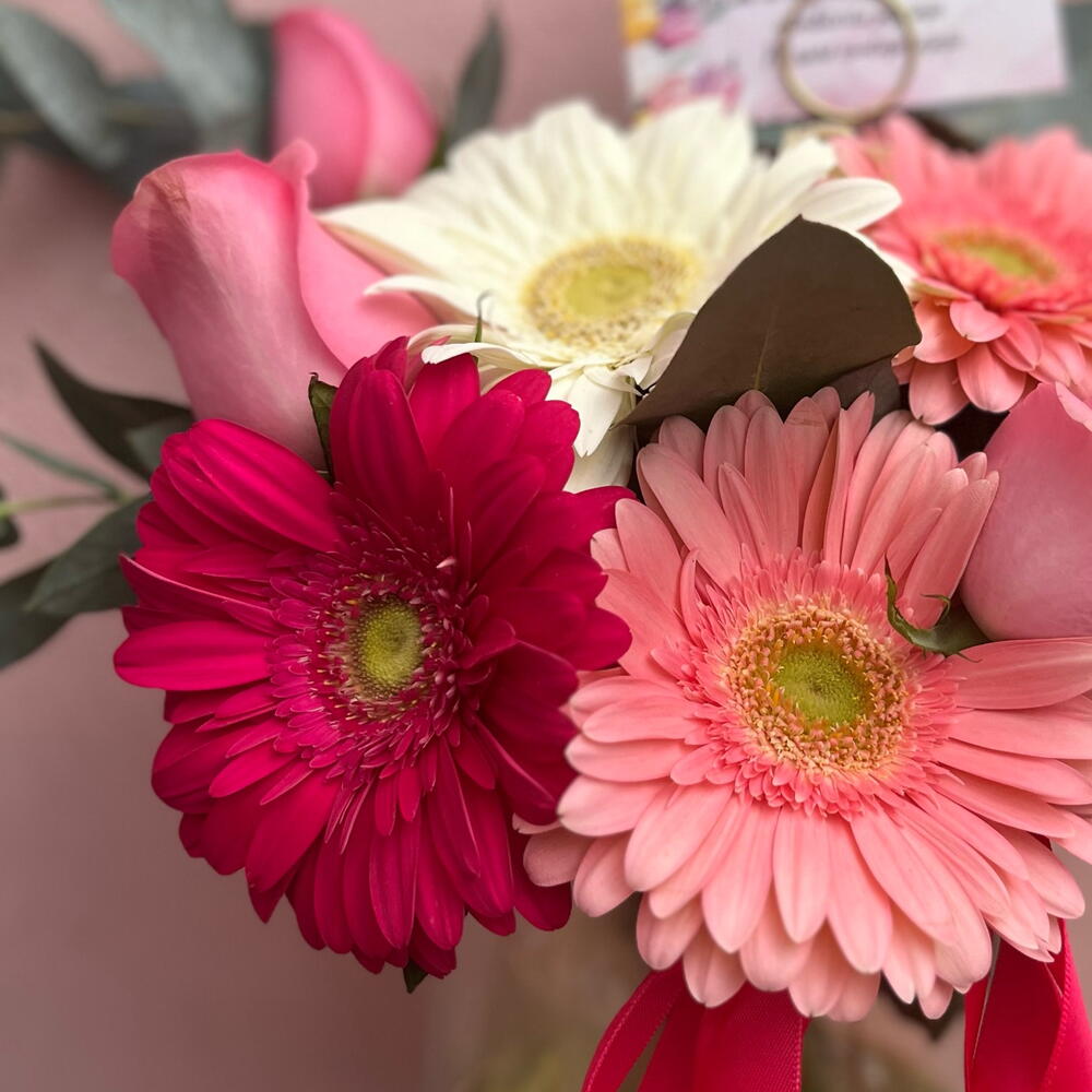 Gerbera - 4 ud. rosas - 5 ud. florero de cristal - 1 ud.