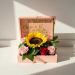girasol - 1 ud. astromelias blancas - 5 ud. roses - 6 ud. caja mdf - 1 ud.