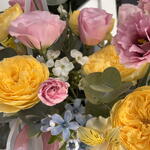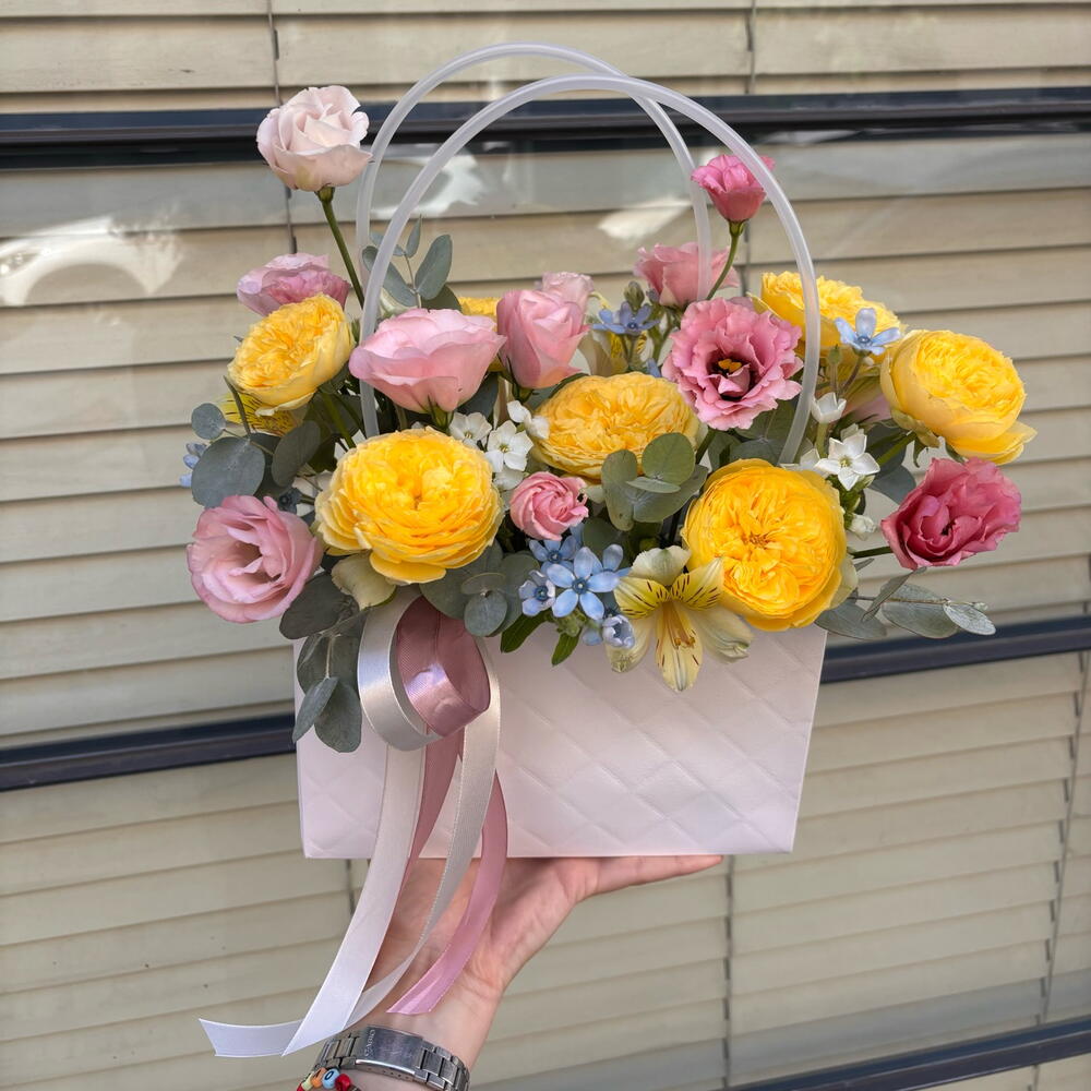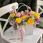 The elegant flower box Charm box is a refined and stylish gift. Inside a neat white box are bright yellow roses, delicate lisianthus, English roses, turquoise oxypetalum, and fragrant eucalyptus. Pastel and sunny shades blend with the softness of pink ribbons, creating a romantic look. This gift is perfect for birthdays, anniversaries, or as a thoughtful gesture, filling the space with floral fragrance and joy.