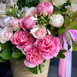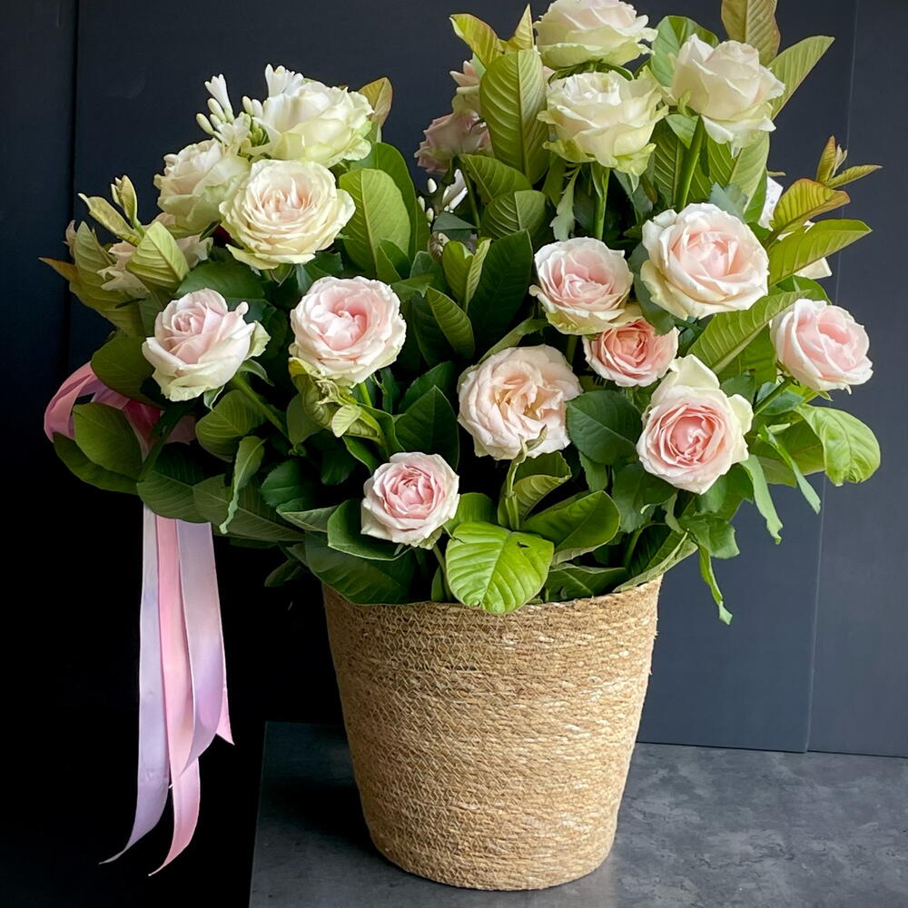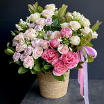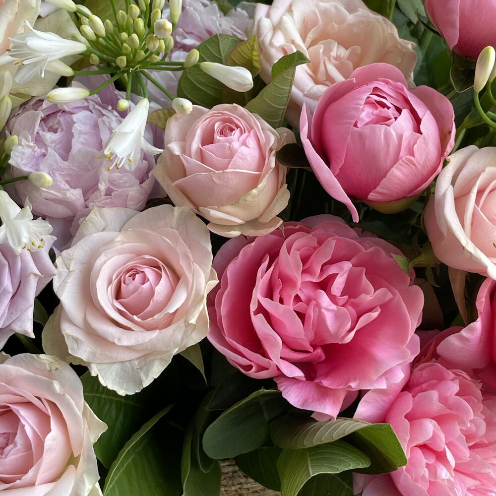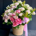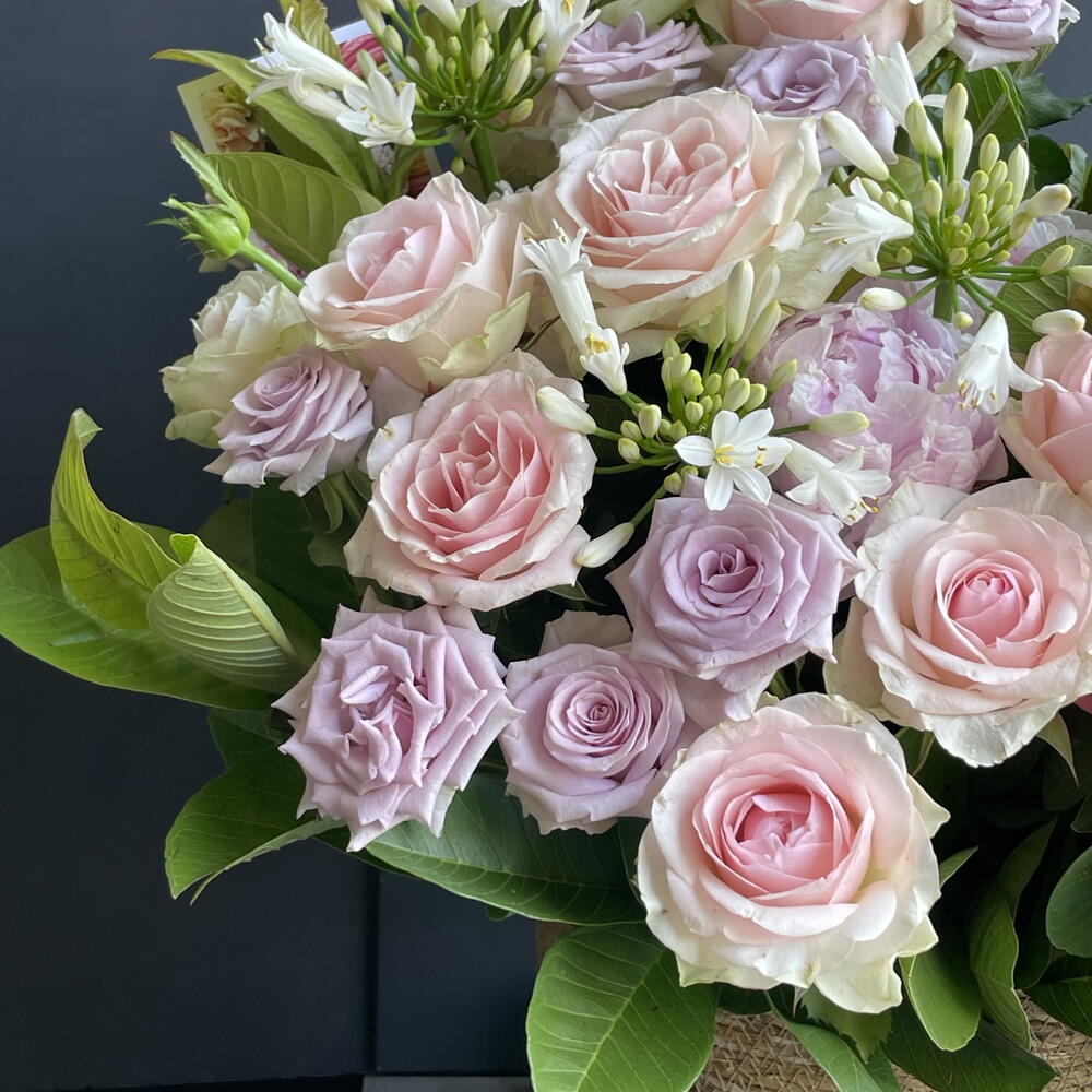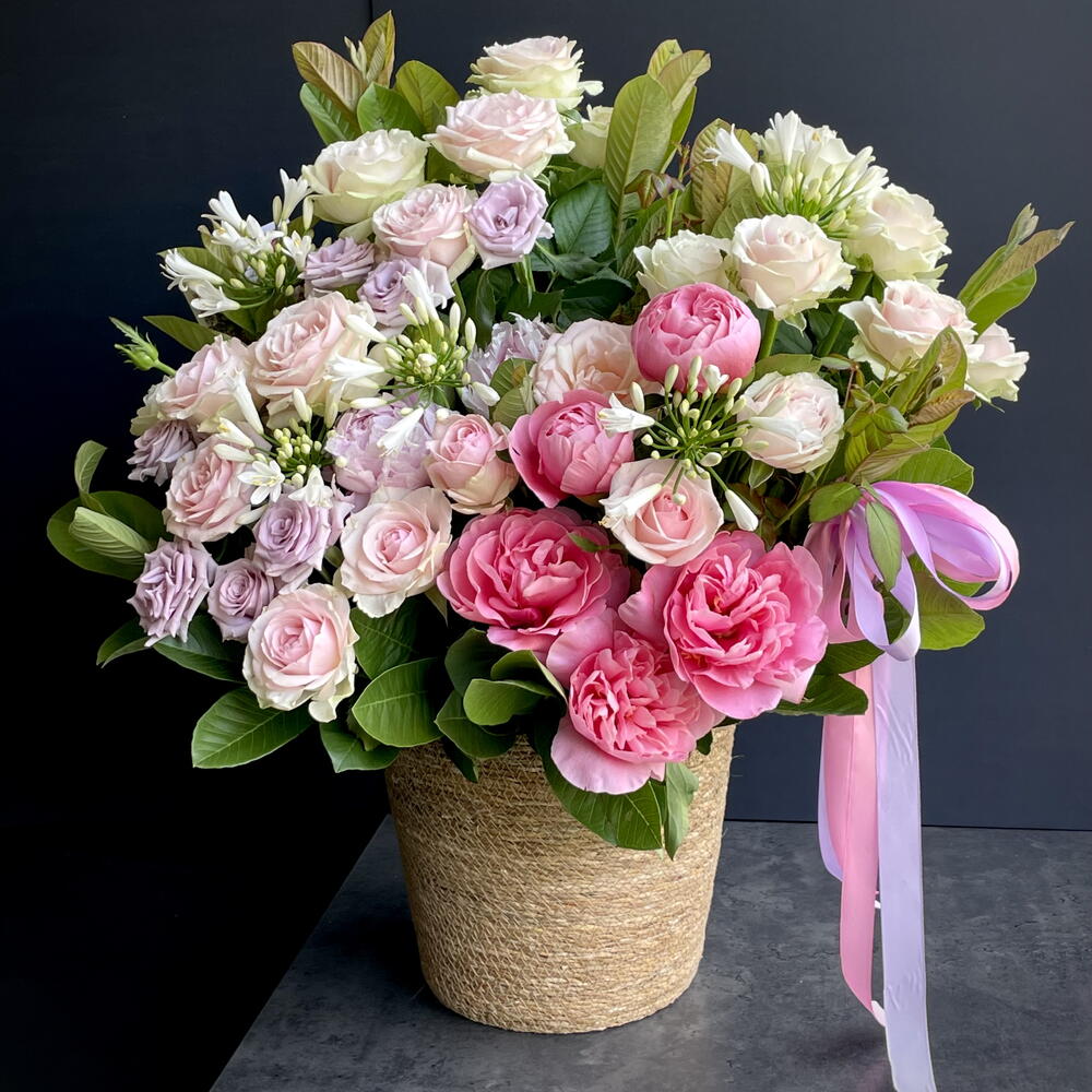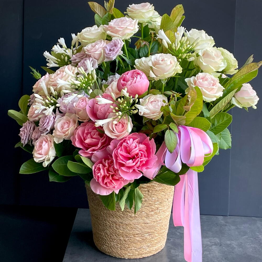Basket - 1 ud. Peony - 5 ud. rose lilac - 7 ud. agapanto - 5 ud. roses pink - 30 ud. guava branches - 10 ud.