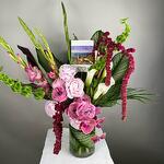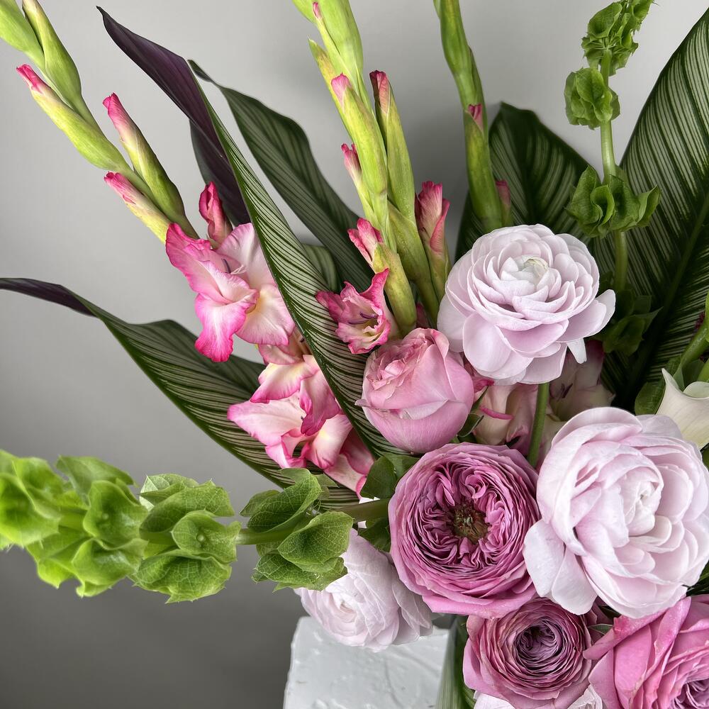 Calathea - 6 ud. ranunculus - 5 ud. gladiolo - 4 ud. amaranthus - 4 ud. phalaenopsis orchid - 1 ud. calas - 5 ud. rosa de jardín premium - 5 ud. campanas irlandesas - 3 ud.