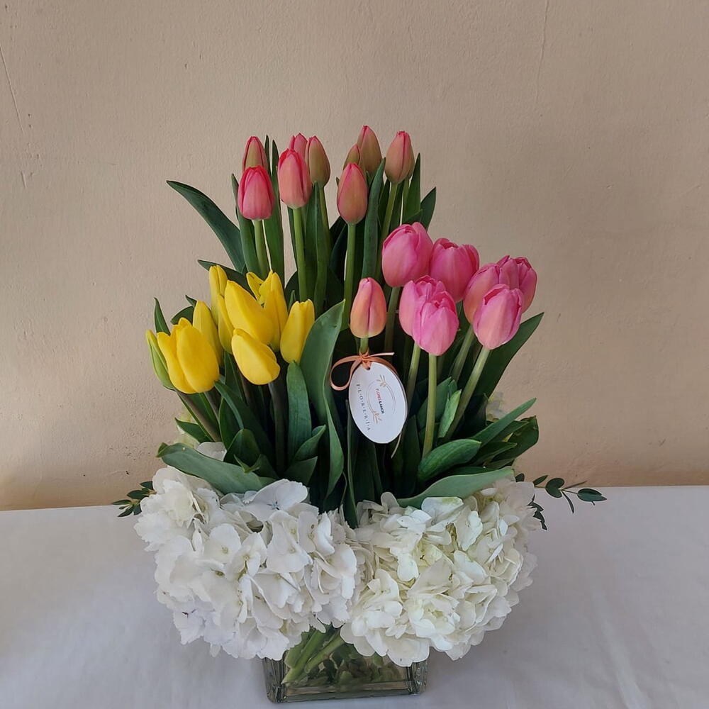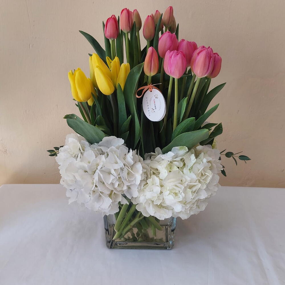 Hermoso arreglo floral compuesto por 30 tallos de tulipanes frescos en una hermosa variedad de colores, presentado en una elegante base de cristal de 20 cm. Hermosas Variedad de Tulipanes destaca por su frescura, colorido y sofisticación, siendo el detalle ideal para sorprender en cumpleaños, aniversarios o cualquier ocasión especial con un regalo lleno de encanto y distinción.