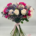 erygnioum - 7 ud. white pink rose equador - 11 ud. pink mini rose stem - 13 ud. purple grass - 5 ud.