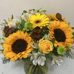 Gerbera - 3 ud. girasoles - 4 ud. rosa amarilla - 4 ud. follajes varios - 10 ud.