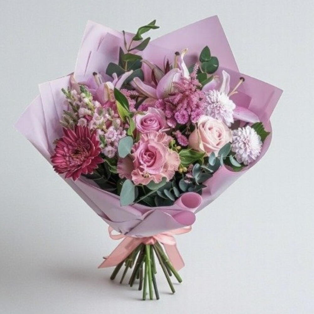 La cinta - 1 ud. Greenery - 5 ud. El crisantemo - 3 ud. Lily - 1 ud. Gerbera - 3 ud. Gypsophila - 2 ud. rose - 3 ud. packaging - 1 ud.