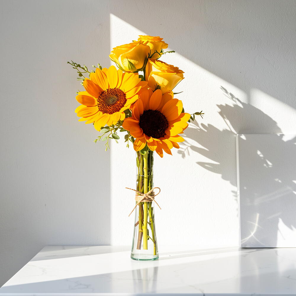 rosas amarillas - 3 ud. girasoles - 2 ud. delicado florero - 1 ud.