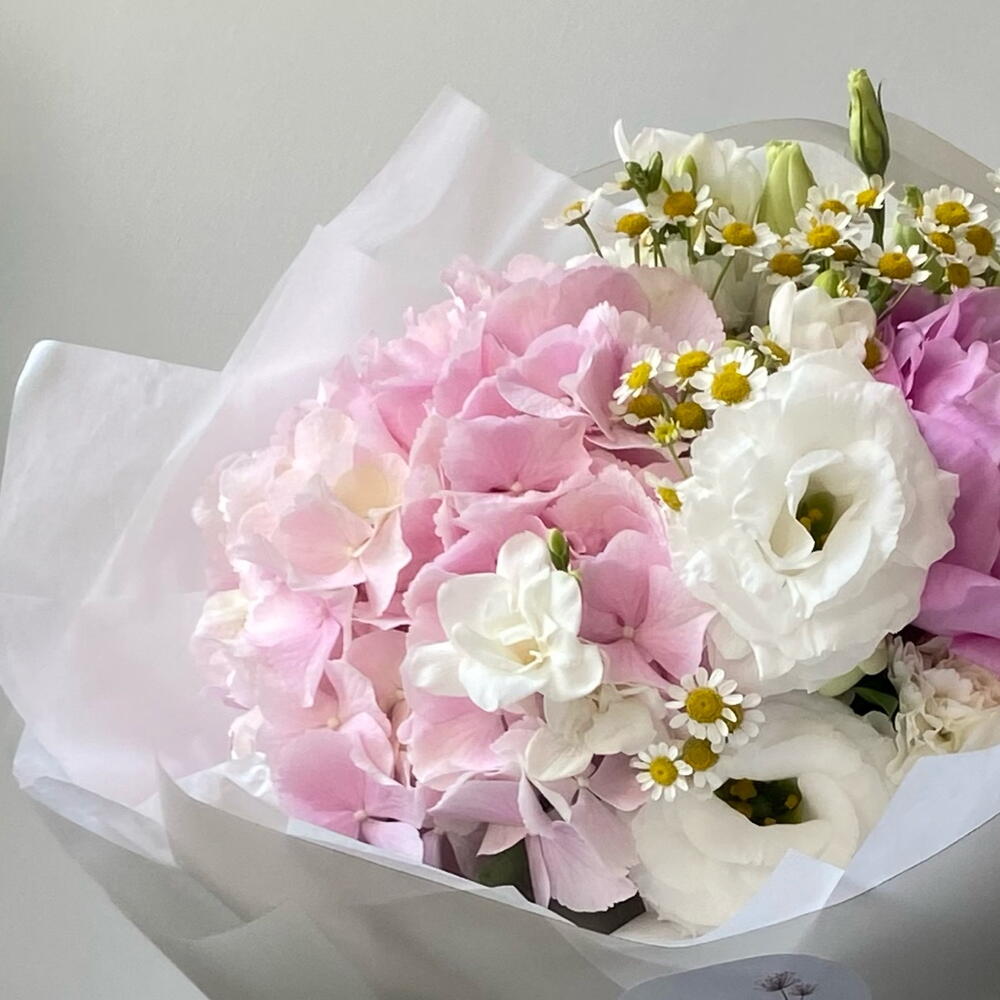 Un delicado y sofisticado ramo con hortensias rosa pálido, fresias delicadas, lisianthus ligeros y elegantes peonías. Envuelto en papel ligero con cintas en tonos pastel, Blush Elegance es perfecto para cumpleaños, aniversarios, bodas o como un detalle romántico. Un delicado y elegante ramo con hortensias rosas, fresias, lisianthus y peonías. El regalo perfecto para un cumpleaños, aniversario o una ocasión especial.