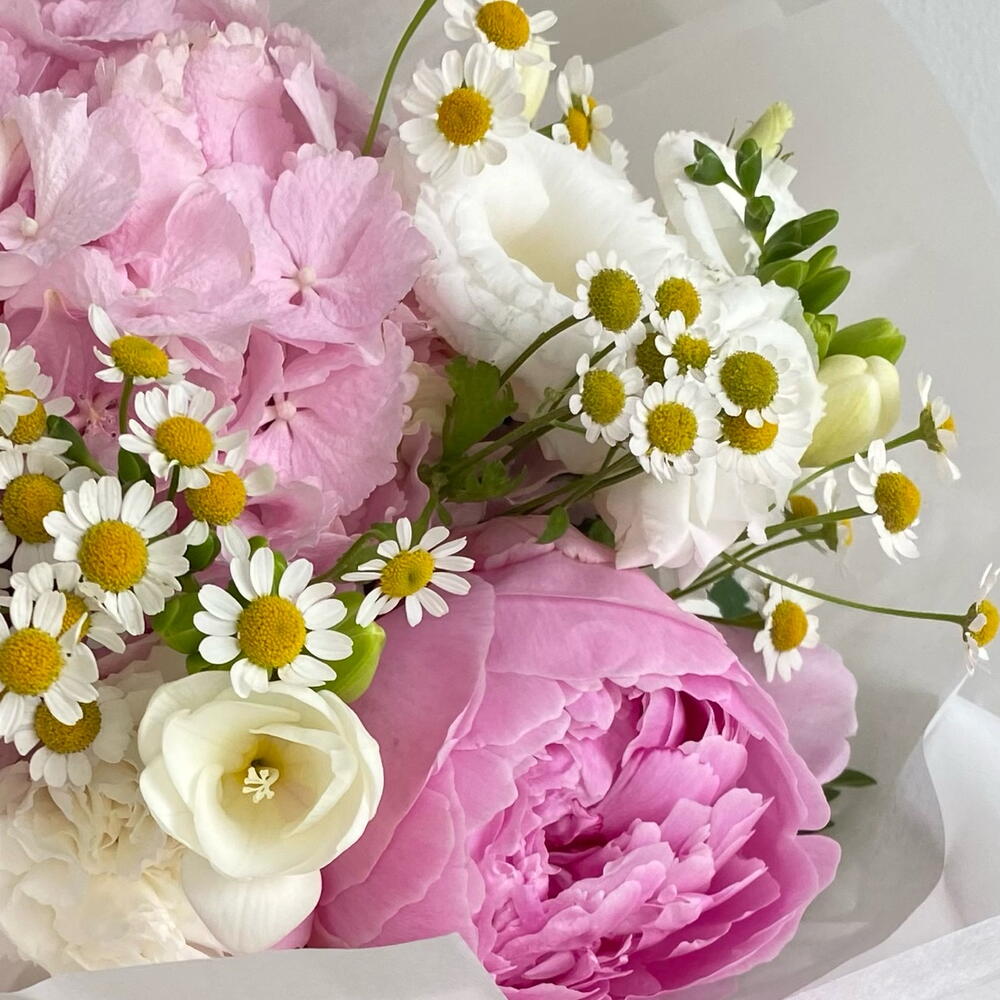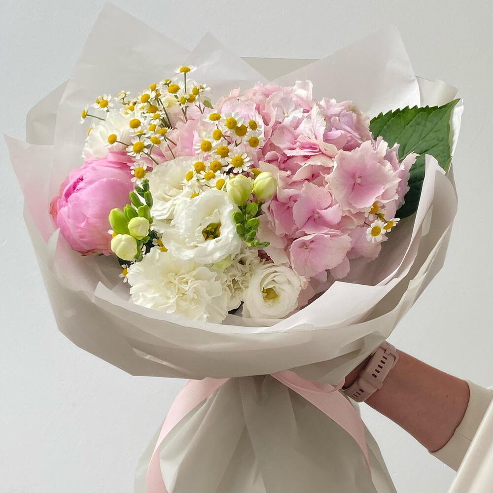 Morning Delight – bukiet z piwonią, hortensją i rumiankiem