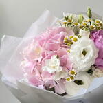 Эустома - 2 ud. Hydrangea - 1 ud. dianthus - 3 ud. fresia - 3 ud. eustoma rosa - 1 ud.