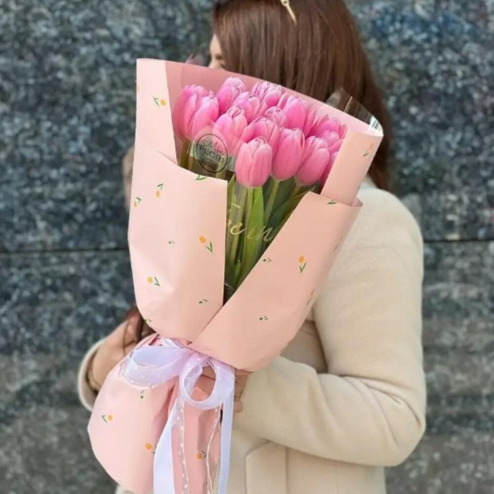 Cinta de raso - 2 ud. El celofán - 1 ud. Embalaje coreano - 2 ud. тюльпаны розовые - 21 ud.
