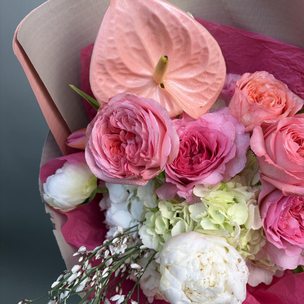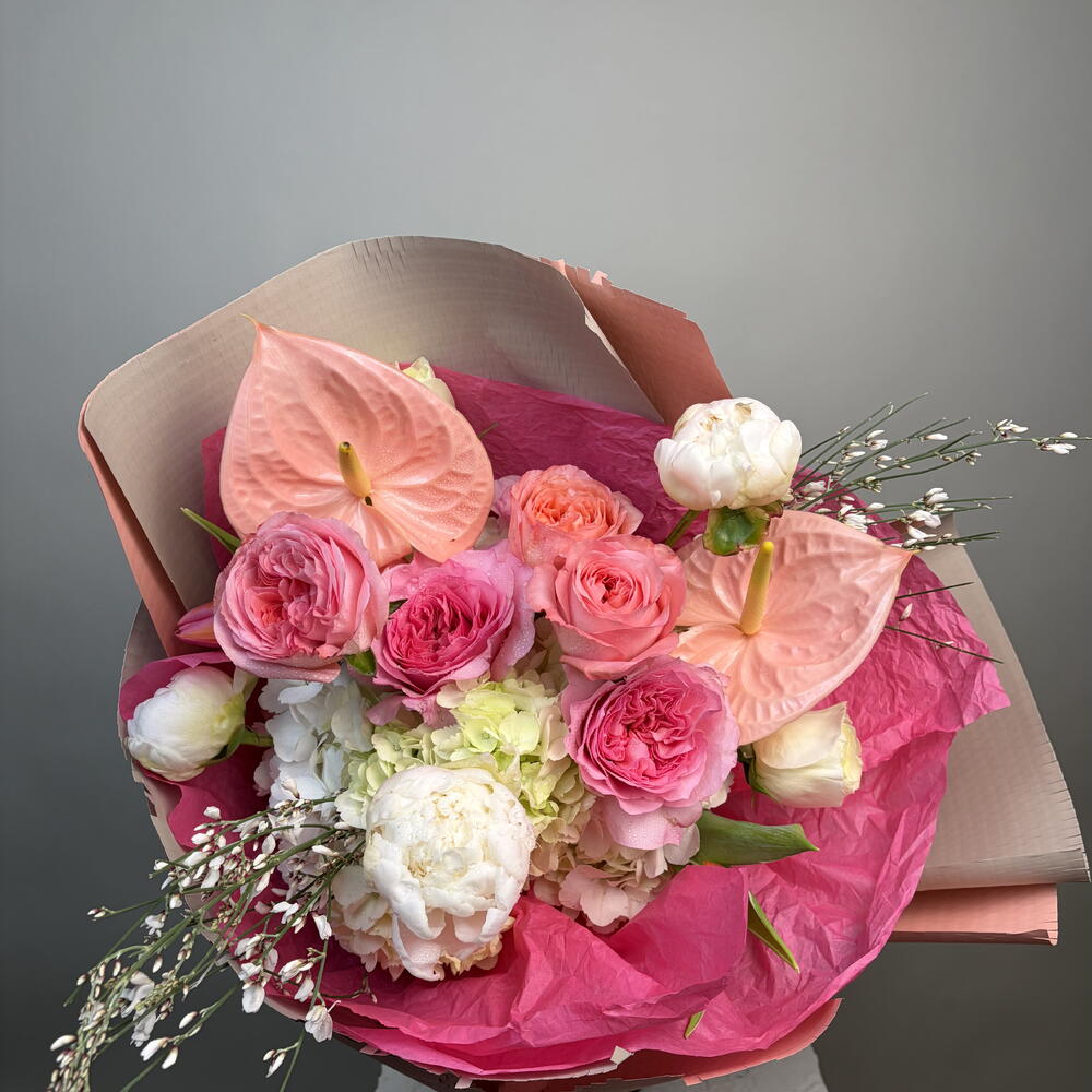Tulips - 5 ud. Anthurium - 2 ud. hortensias - 4 ud. genista - 2 ud. peonías blancas - 3 ud. mezcla de rosas de jardín - 8 ud.