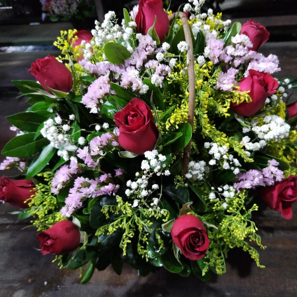 Solidago - 15 ud. baby breath - 15 ud. rosas rojas - 12 ud. estatice - 10 ud.