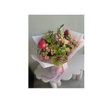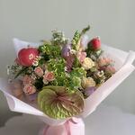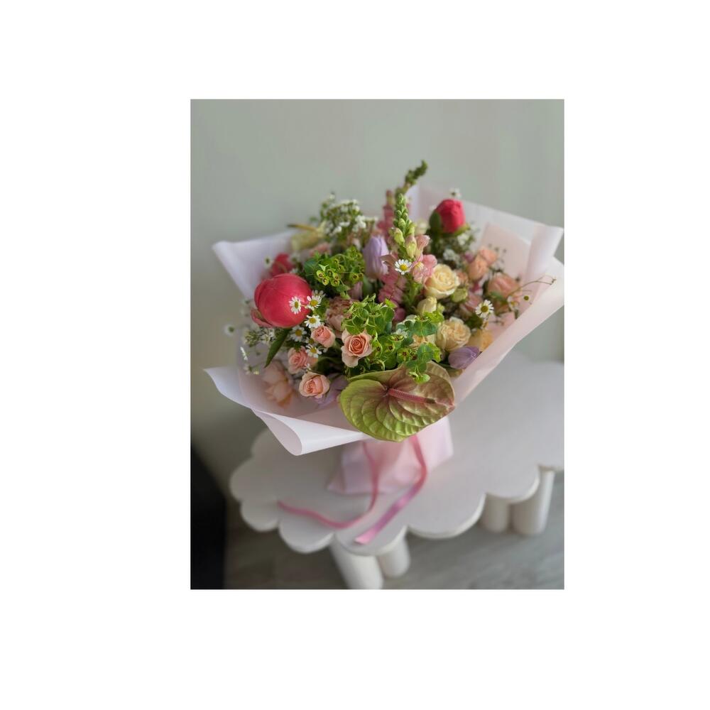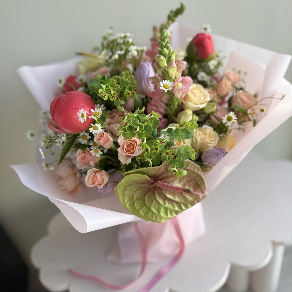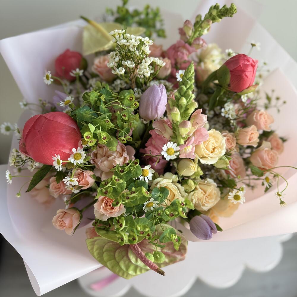 Snapdragon - 3 ud. Tulips - 6 ud. Anthurium - 2 ud. Peonies - 3 ud. cera - 3 ud. camomile - 3 ud. greenery mix - 3 ud. spray roses - 7 ud.