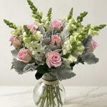 Florero de vidrio con bello diseño en tonos claros para demostrar a esa persona lo especial e importante que es, elaborado con rosas color de rosa, perros blancos y Miller gris que le da esa combinación perfecta.