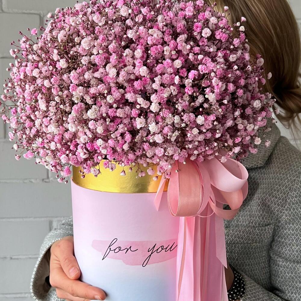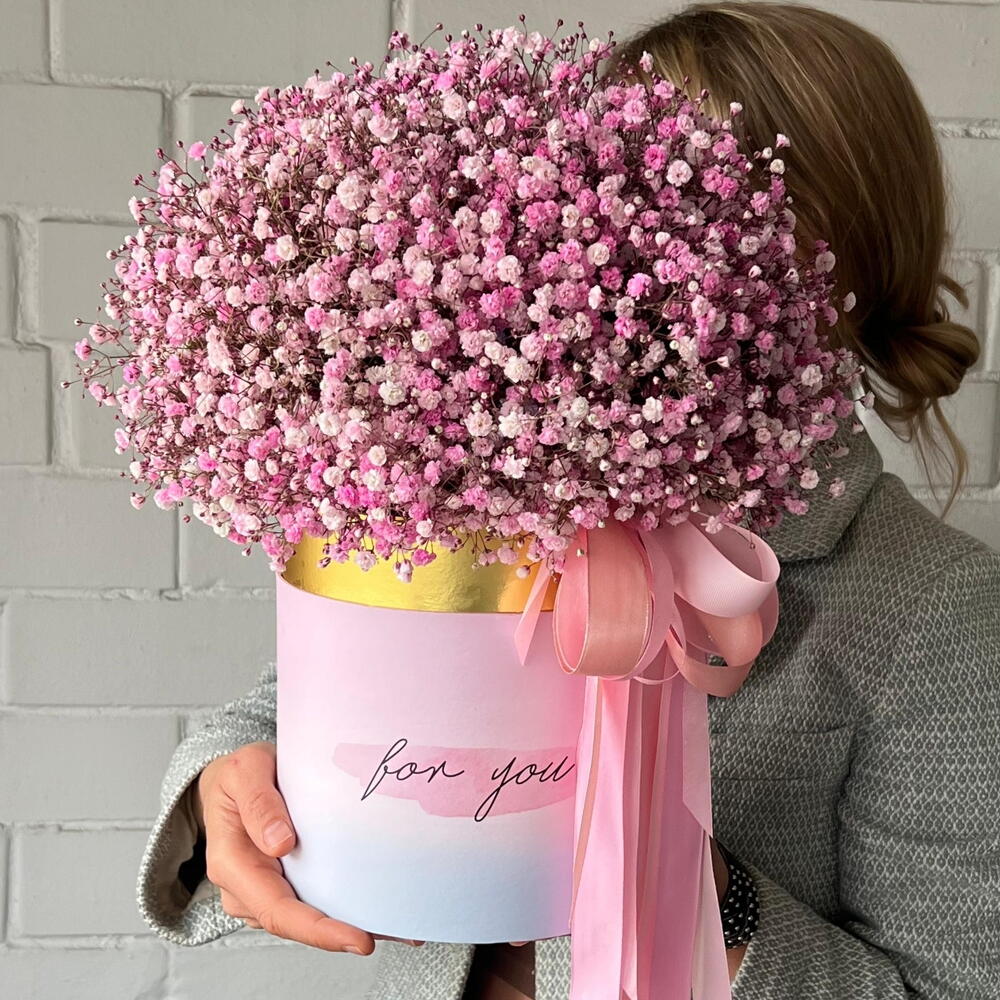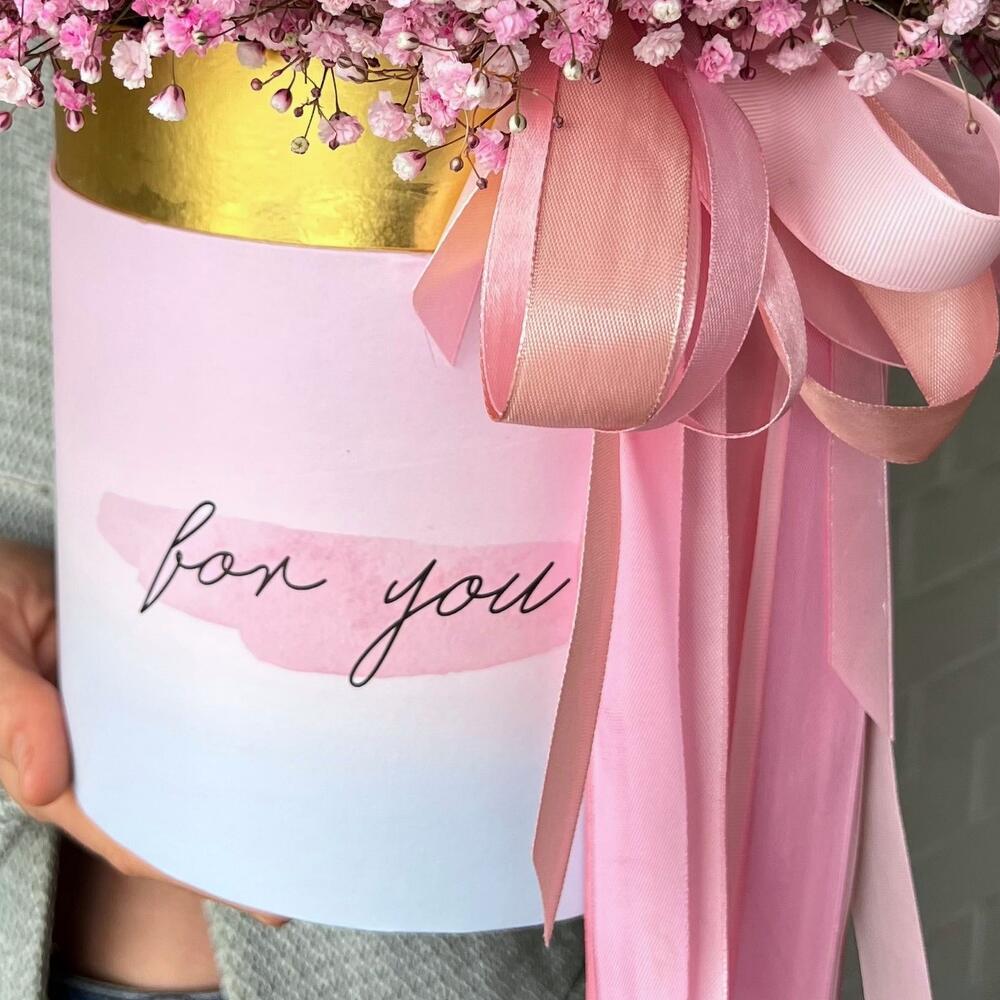 La cinta - 3 ud. Gypsophila - 25 ud. hat box - 1 ud. mini card (if you want to write a greeting) - 1 ud.