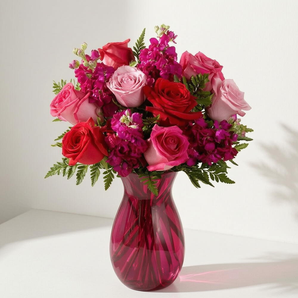 El romanticismo en su máxima expresión se muestra en este impactante ramo de rosas, llevará todo su amor y deseos de corazón a su amada. Rosas rosadas, rojas y lavanda se mezclan con aromatico alheli color fucsia, arreglados perfectamente con follajes verdes en un florero de cristal rosado. Perfecto para celebrar un aniversario, para decir “te amo” o como regalo del Día de Valentín