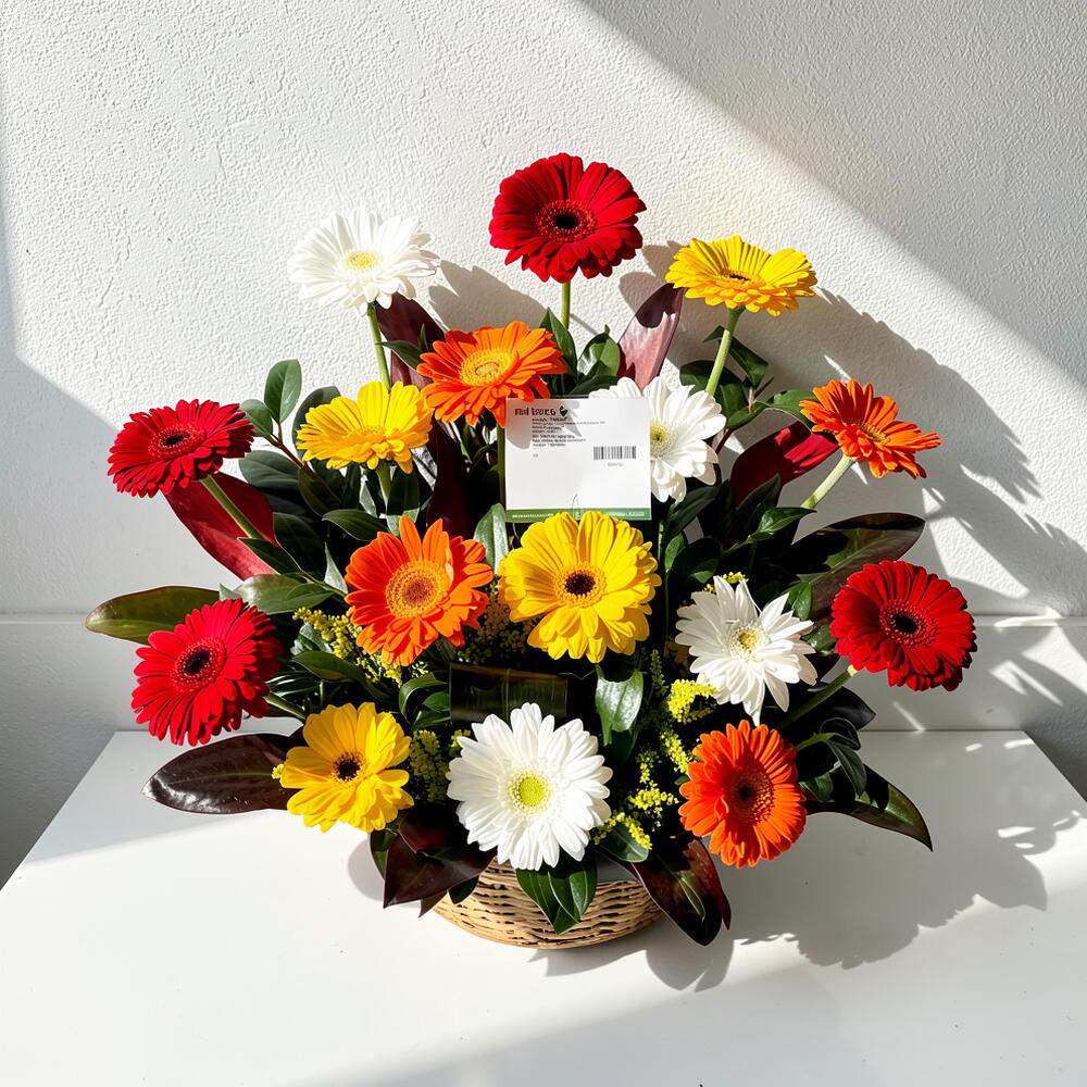 Una alegre canasta llena de frescura y color con un mix de gerberas en tonos amarillos, naranjas, blancos y rojos profundos
