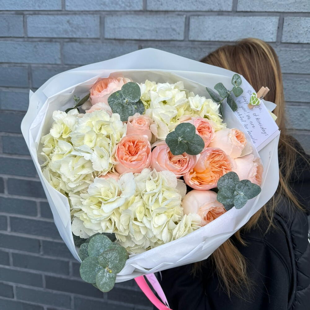 Romeo Juliet Bouquet (rosas peonía Juliet, hortensias blancas, eucalipto)