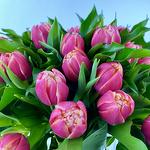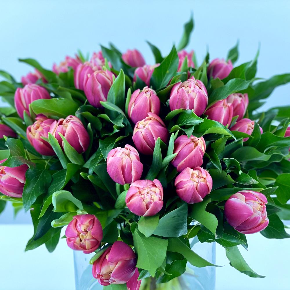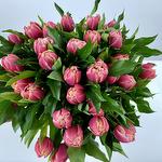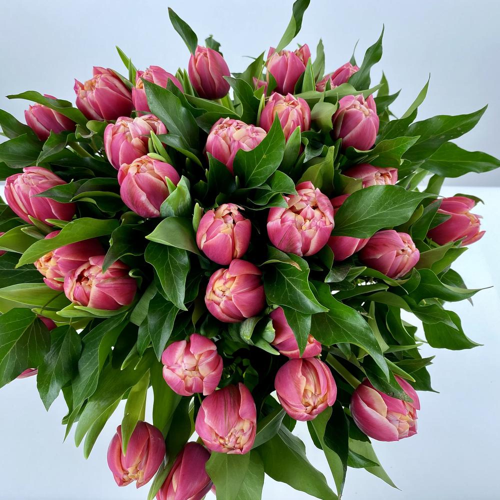 Bouquet of tulips 25 double tulips with simple seasonal green stuff Height 40 cm, diameter 45 cm possible colors: pink / pink / orange / cream