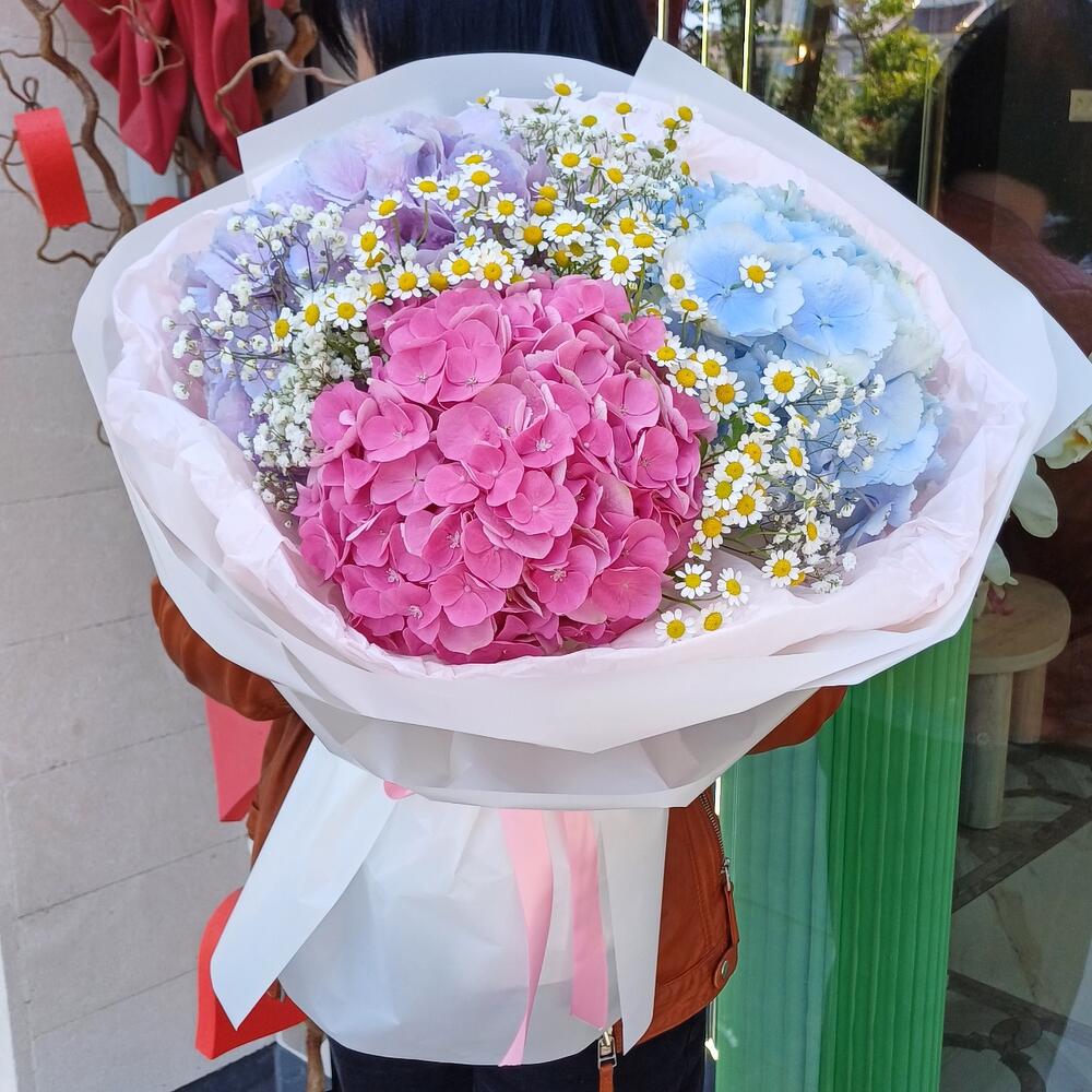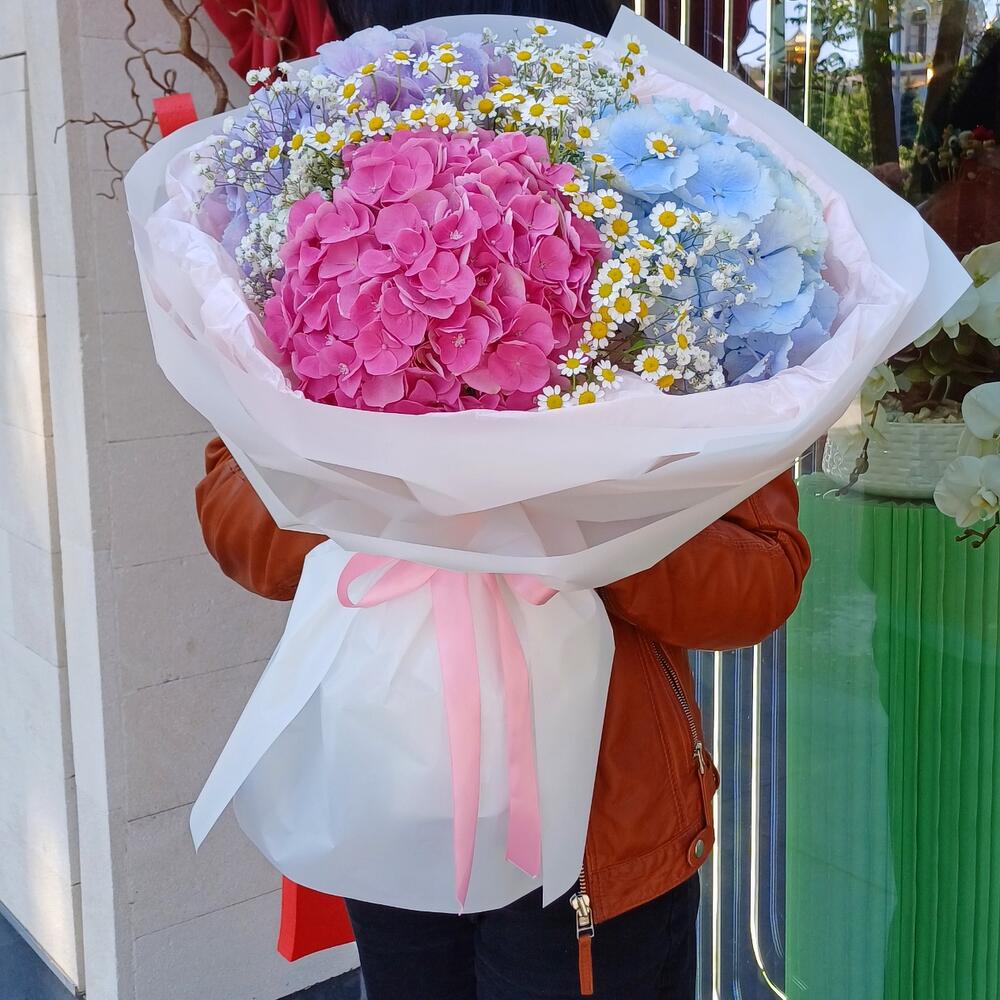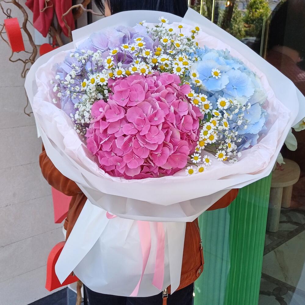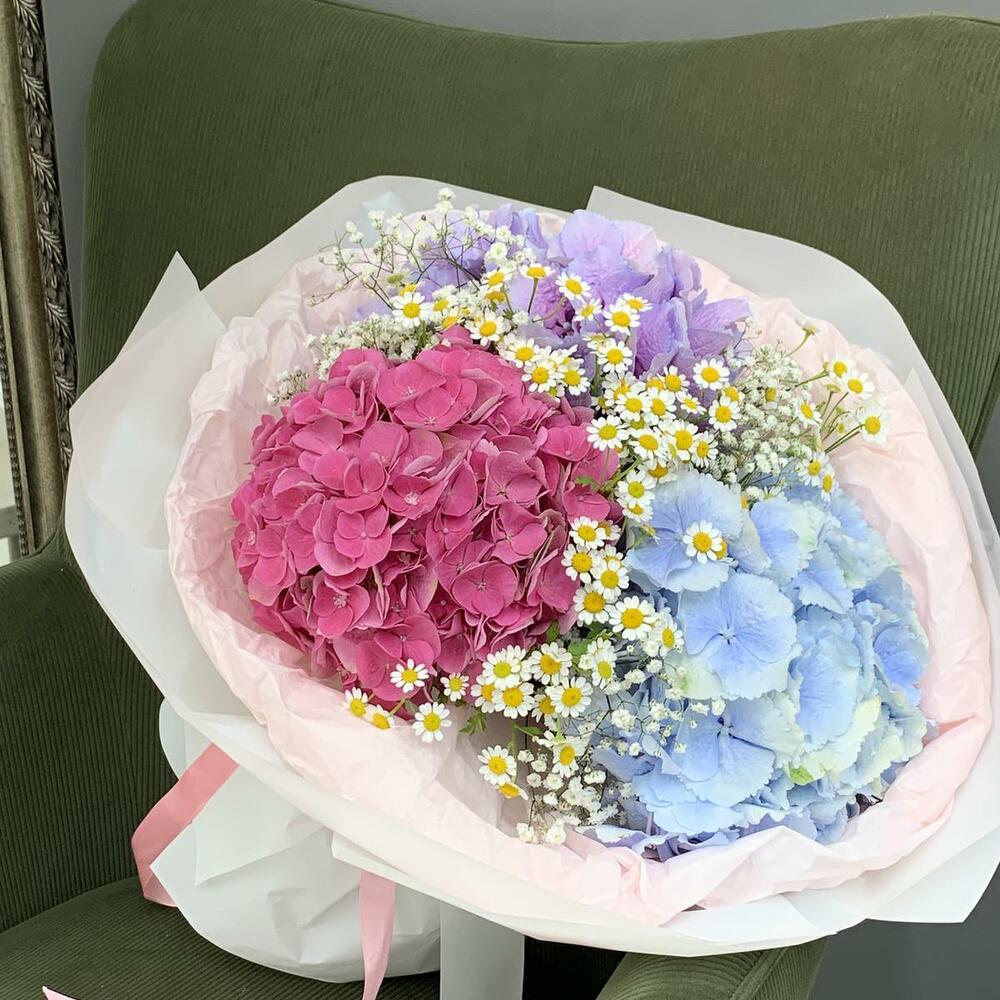 Танацетум camilla o crisantemo Сталион - 5 ud. Hortensia azul - 1 ud. Hortensia fucsia - 1 ud. Silencio rosa - 3 ud. Hortensia lavanda - 1 ud. gypsophila blanca - 3 ud. корейская упаковка листы - 5 ud.