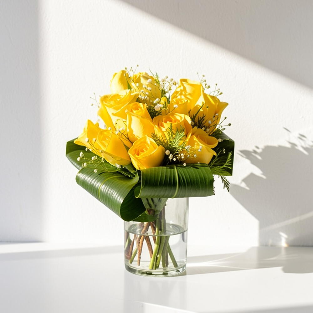 rosas amarillas - 12 ud. florero de cristal - 1 ud.