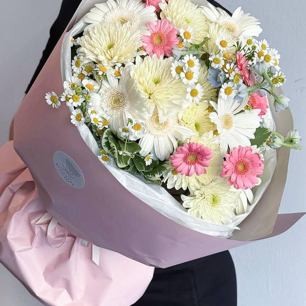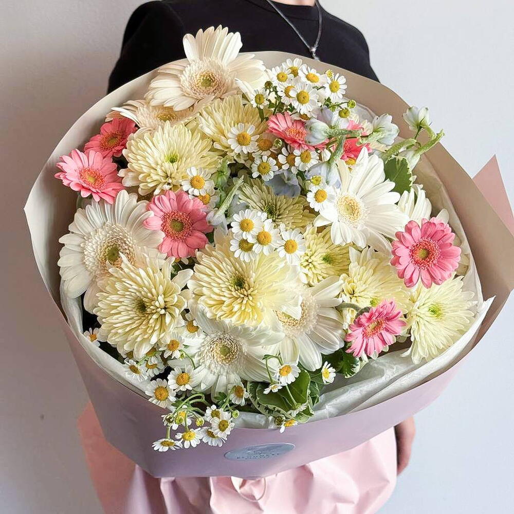 El crisantemo - 4 ud. Pink mini gerbera - 9 ud. manzanilla - 4 ud. delphinium - 3 ud. phytosforum - 6 ud. gerbera mikro - 7 ud.