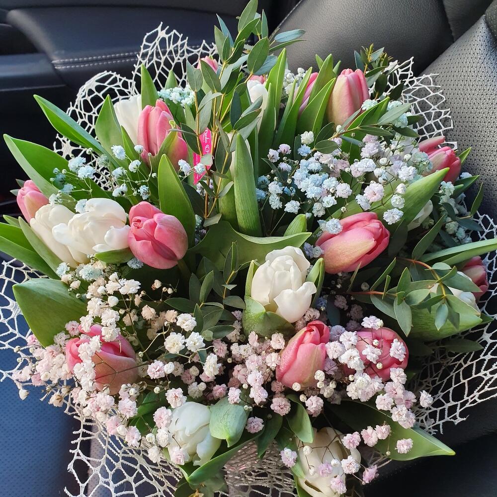 Гипсофила - 2 ud. Eucalyptus - 2 ud. Tulips - 25 ud.