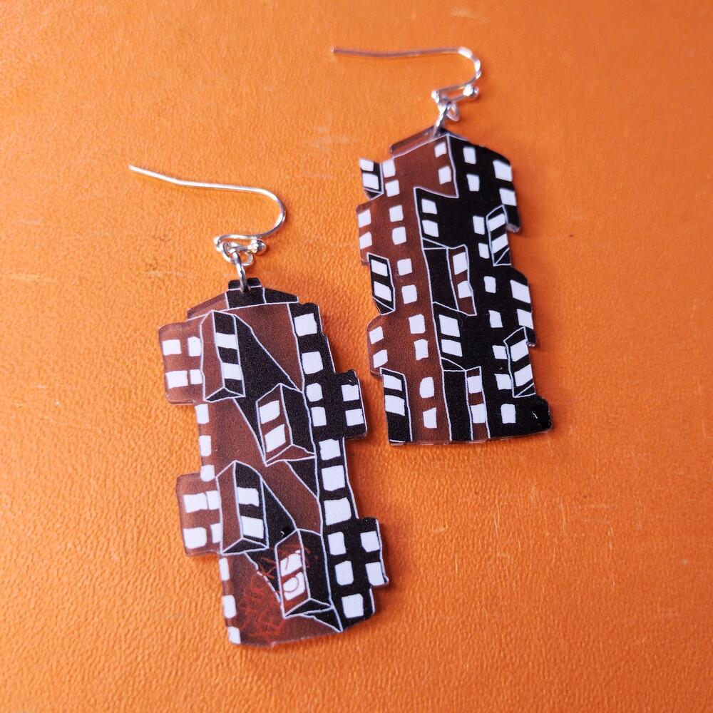 Grey and white earrings inspired by the iconic architecture of Belgrade in the form of a house. Size of each 22x44 mm, earhook material stainless steel
