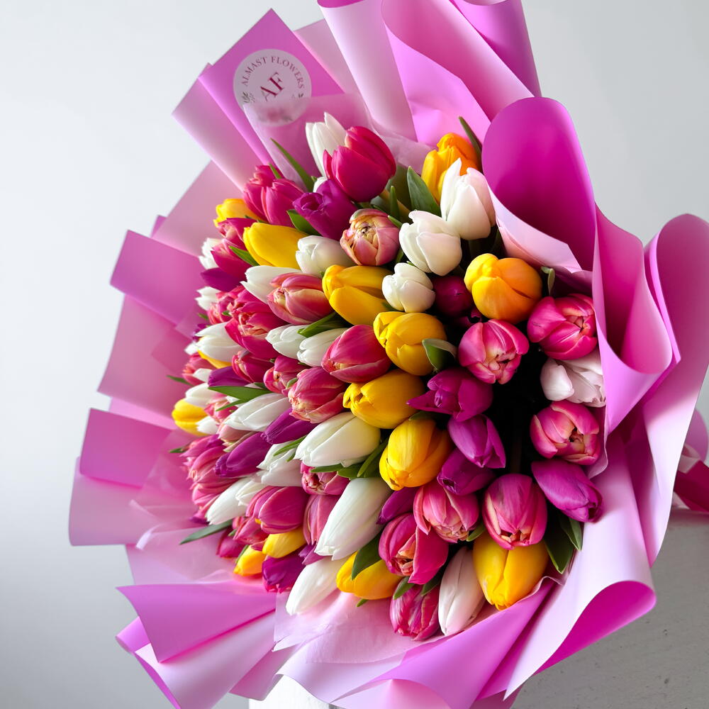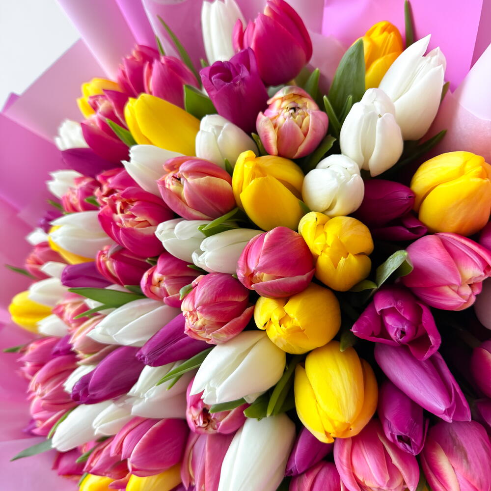 pink tulips - 25 pcs white tulips - 25 pcs yellow tulips - 25 pcs purple tulips - 26 pcs