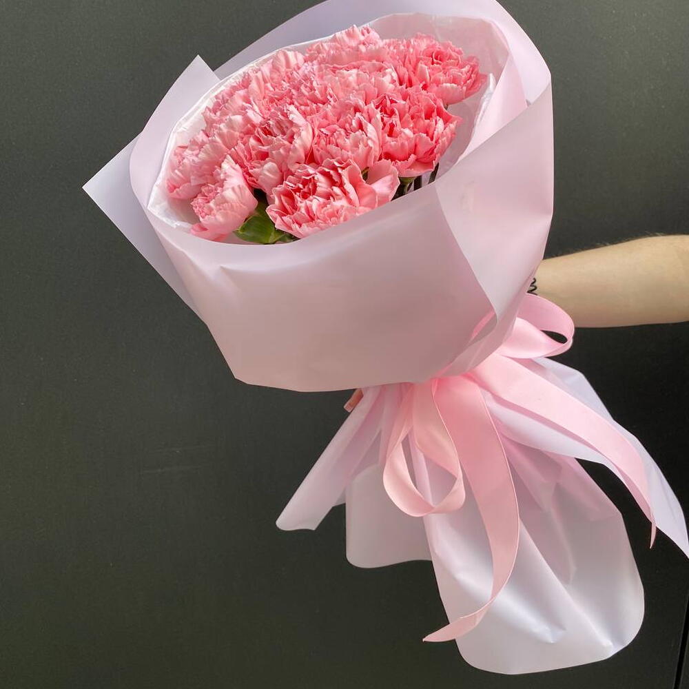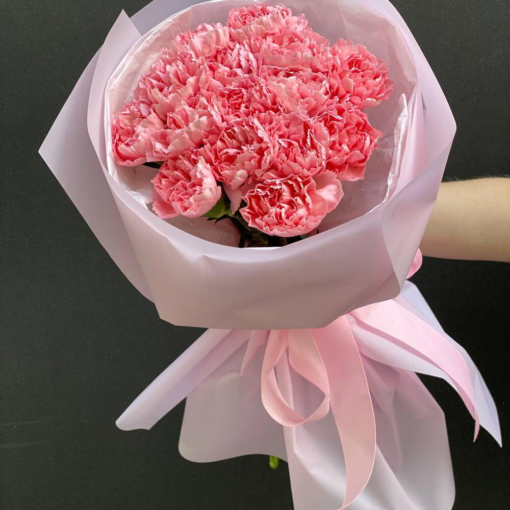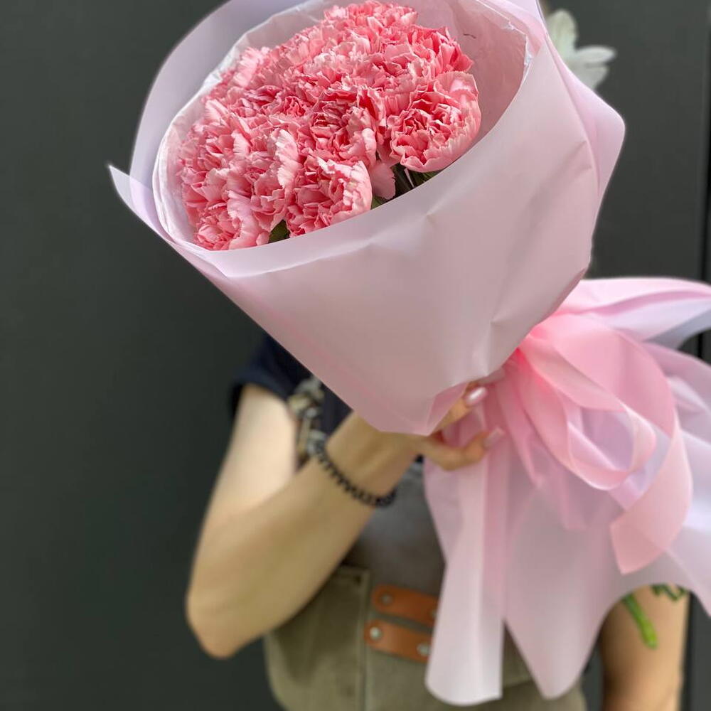 Delicate bouquet of 15 pink carnations A charming bouquet composed of 15 pink carnations – flowers that symbolize tenderness, care, and sincere feelings. Its light fragrance and fluffy form give the composition a romantic character. The bouquet has been carefully packed in elegant packaging in delicate shades, which highlights the natural beauty of the flowers. Perfect for special occasions, expressing feelings, or as a nice gesture without a specific reason.