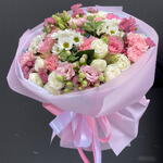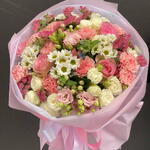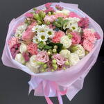 decorative paper - 1 pcs carnations - 2 pcs limonium - 5 pcs roses "bombastik" - 4 pcs Santini chrysanthemums - 6 pcs oxypetalum - 5 pcs roses from Ecuador - 11 pcs