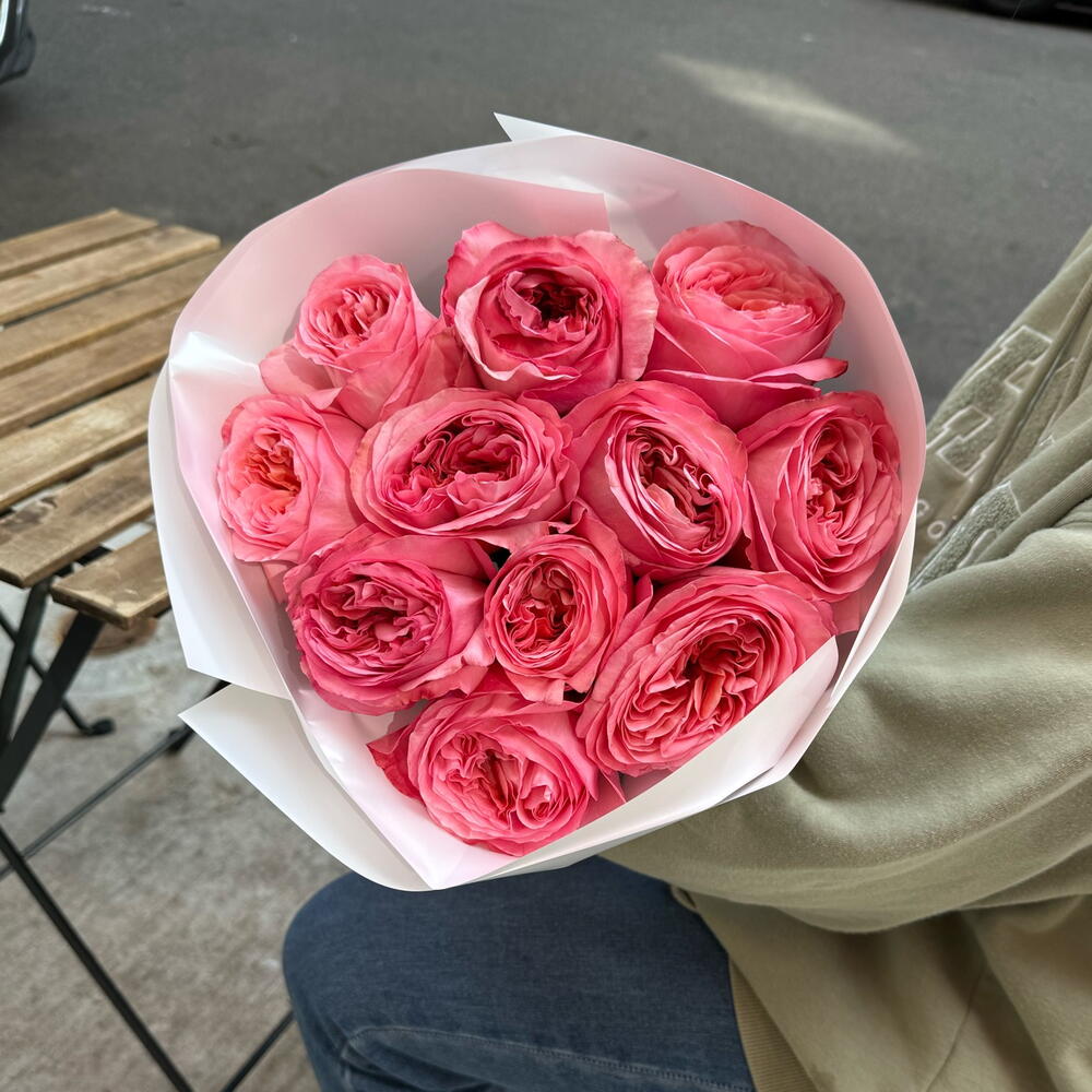 A lush, eye-catching composition of dusty pink and peach shades is the embodiment of exquisite luxury. The undisputed star of this gorgeous bouquet is the garden rose Pink Expression. Its exquisite complex shade and volume will not leave even the most sophisticated connoisseur indifferent. A bouquet of roses will suit a lady with exquisite taste who knows exactly what she wants. Add to favorite to not lose! HOW TO CARE OF FLOWERS? Do not remove the wrapping paper from the bouquet, so then flowers will live longer Change the cold water in a vase every day Keep the vase clean Cut the stem of each flower every two days Keep the bouquet out of a direct sun, drafts and heaters Add the flower food 2-3 days after you’ve bought your bouquet (We add the flower food to every bouquet)