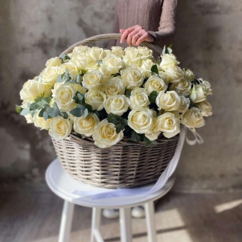 Basket - 1 pcs Eucalyptus - 10 pcs Dutch Rose - 151 pcs satin ribbons - 3 pcs additional materials - 1 pcs