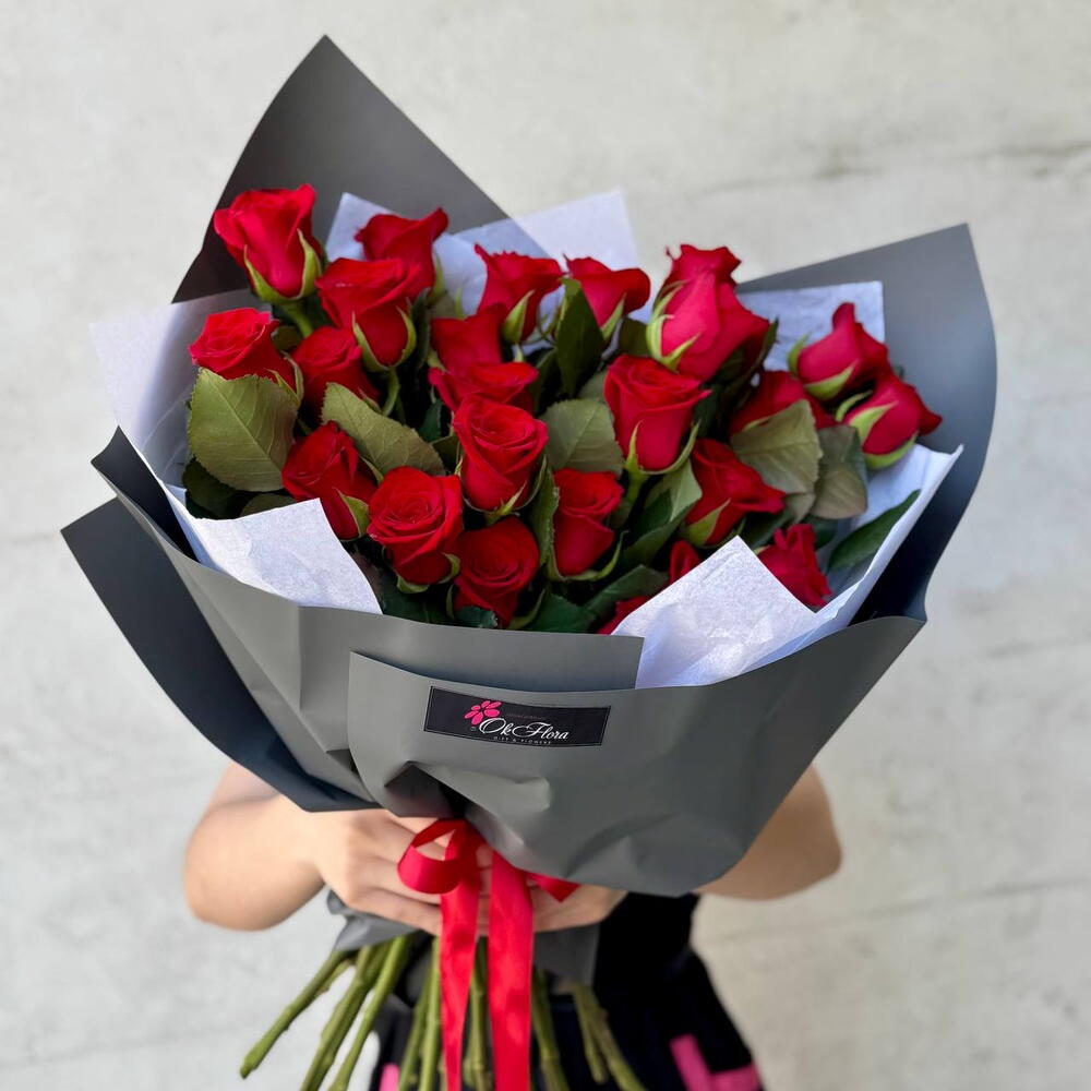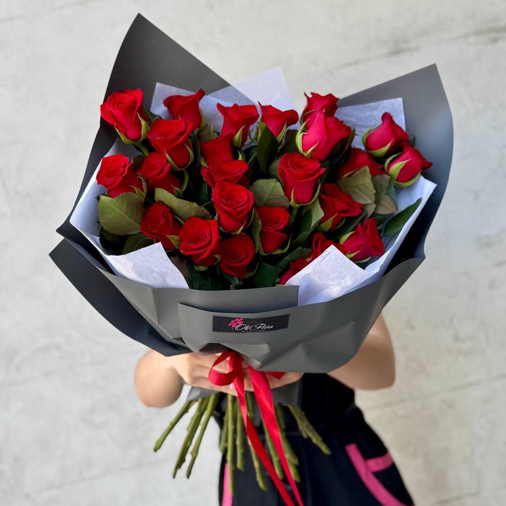 Packaging with a satin ribbon - 5 pcs red roses 50-60 cm - 25 pcs