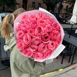 Букет красивый получился. Доставили немного позже назначенного времени, не критично для нас это было. Фото отчет сделали быстро. Доставка считаю дорогая, плюс большие розы не первой свежести были.