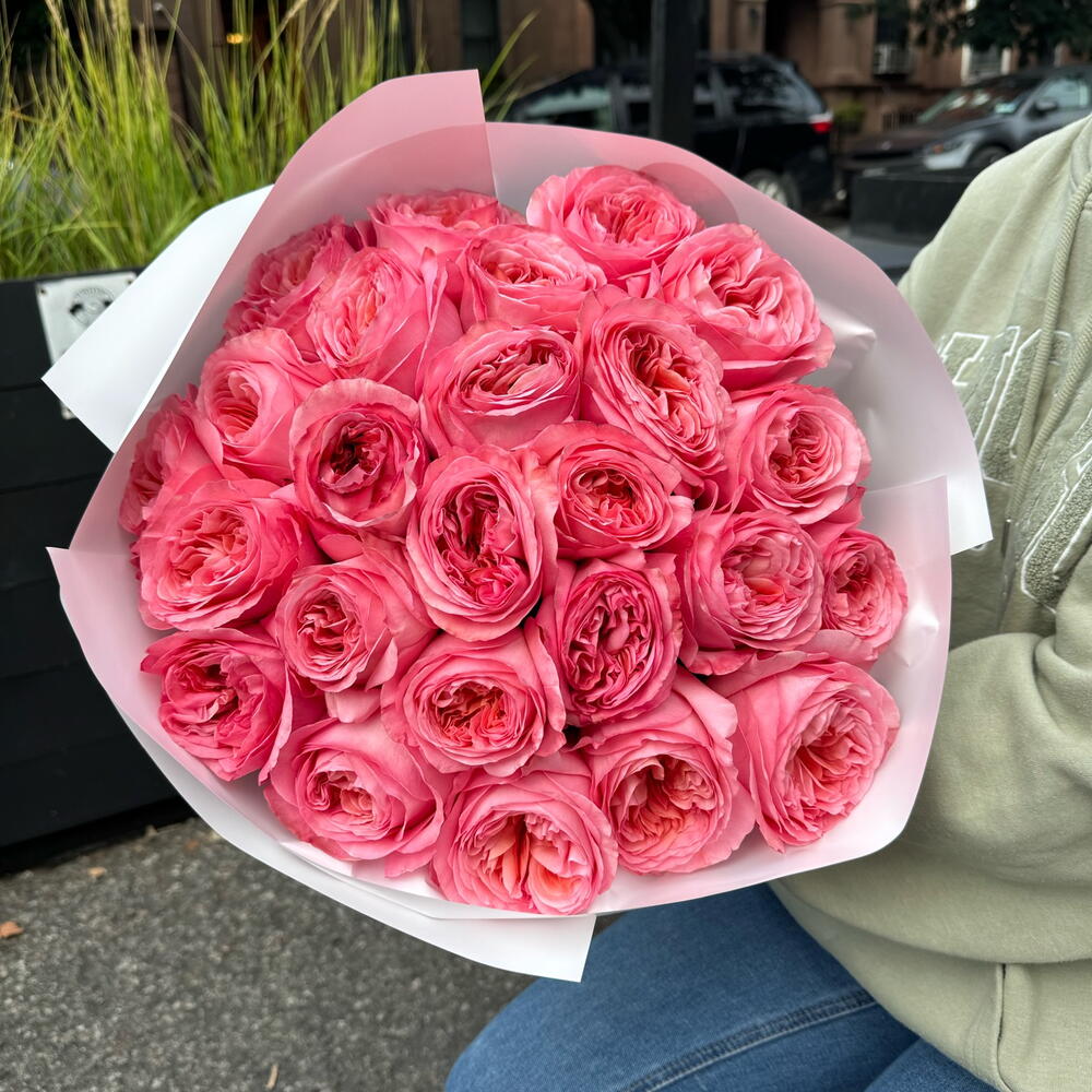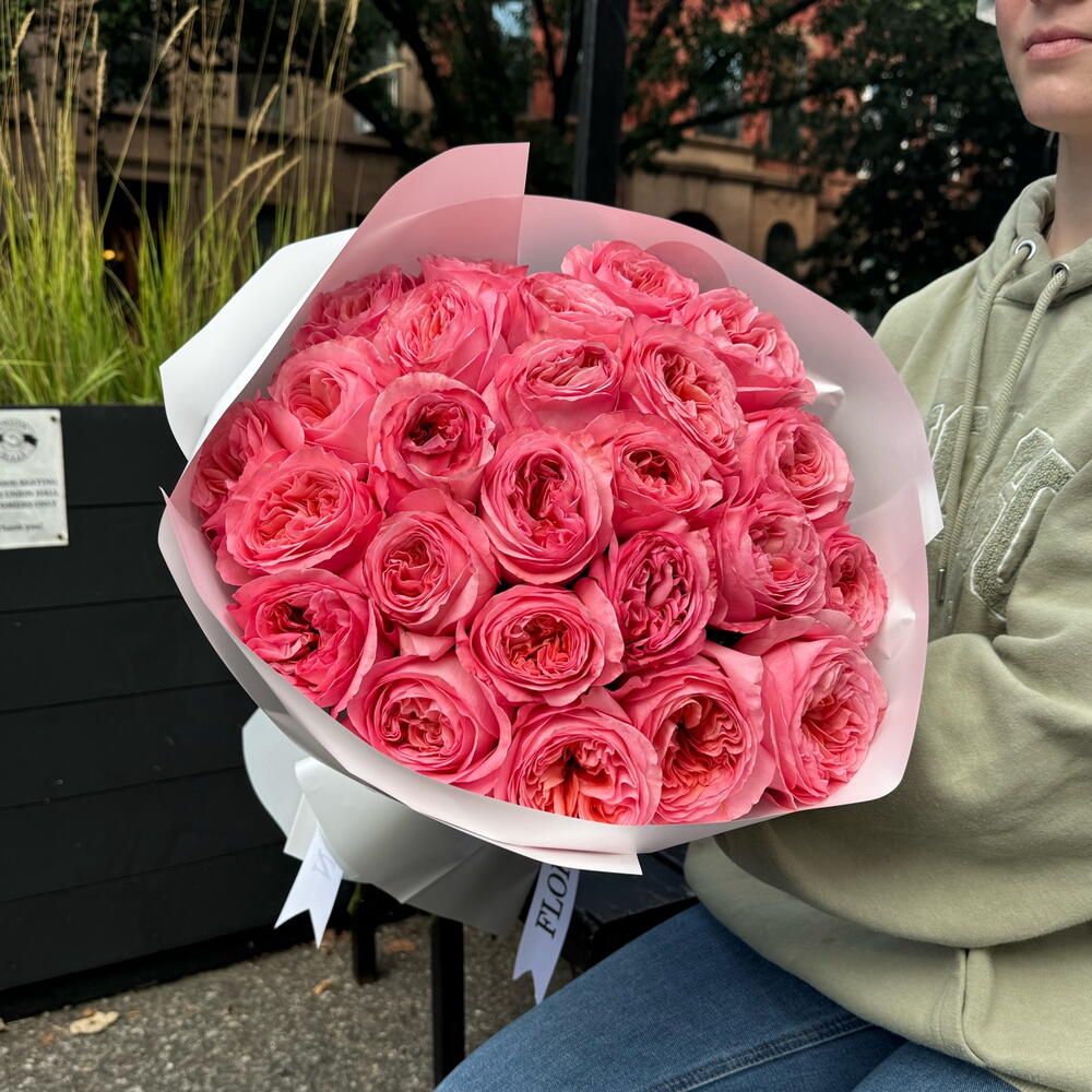 A lush, eye-catching composition of dusty pink and peach shades is the embodiment of exquisite luxury. The undisputed star of this gorgeous bouquet is the garden rose Pink Expression. Its exquisite complex shade and volume will not leave even the most sophisticated connoisseur indifferent. A bouquet of roses will suit a lady with exquisite taste who knows exactly what she wants. Add to favorite to not lose! HOW TO CARE OF FLOWERS? Do not remove the wrapping paper from the bouquet, so then flowers will live longer Change the cold water in a vase every day Keep the vase clean Cut the stem of each flower every two days Keep the bouquet out of a direct sun, drafts and heaters Add the flower food 2-3 days after you’ve bought your bouquet (We add the flower food to every bouquet)