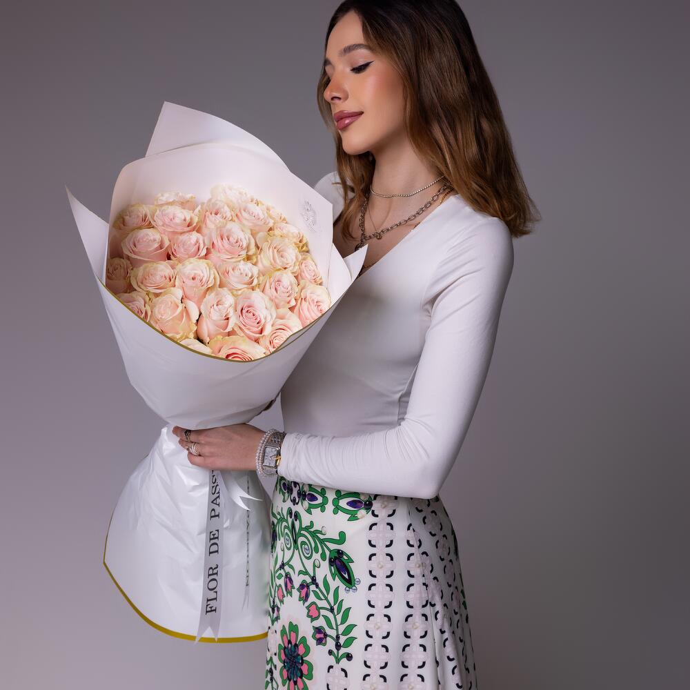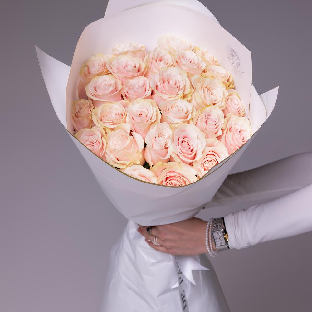 Monobouquet of premium Pink Mondial roses, the petals of which have an unusual color - from pink to cream. Reminiscent of delicious cakes or sweet creamy caramels, they will appeal to absolutely everyone. Perfect roses are packed in perfect translucent paper, which emphasizes their extraordinary color. Since all flowers are individual, just like people, the bouquet may be slightly different. But we try to repeat each bouquet as much as possible, as on the photo in the product card. Add to favorite to not lose! HOW TO CARE OF FLOWERS? Do not remove the wrapping paper from the bouquet, so then flowers will live longer Change the cold water in a vase every day Keep the vase clean