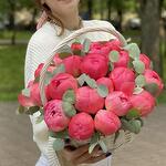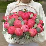 25 пионов Корал в корзине с эвкалиптом