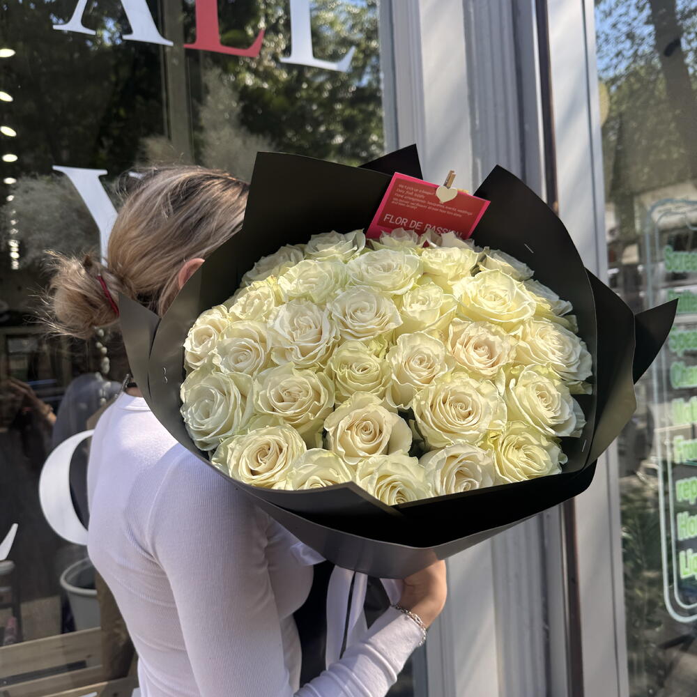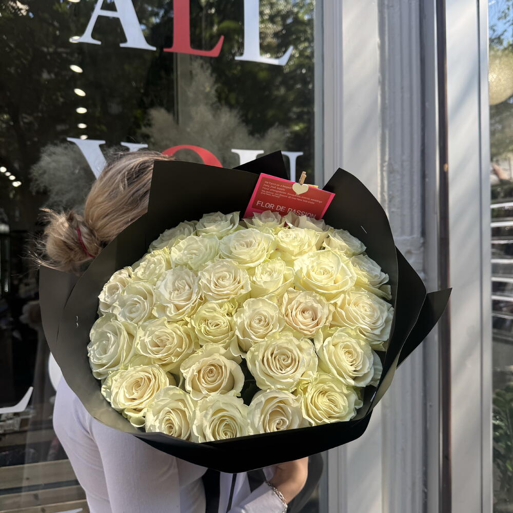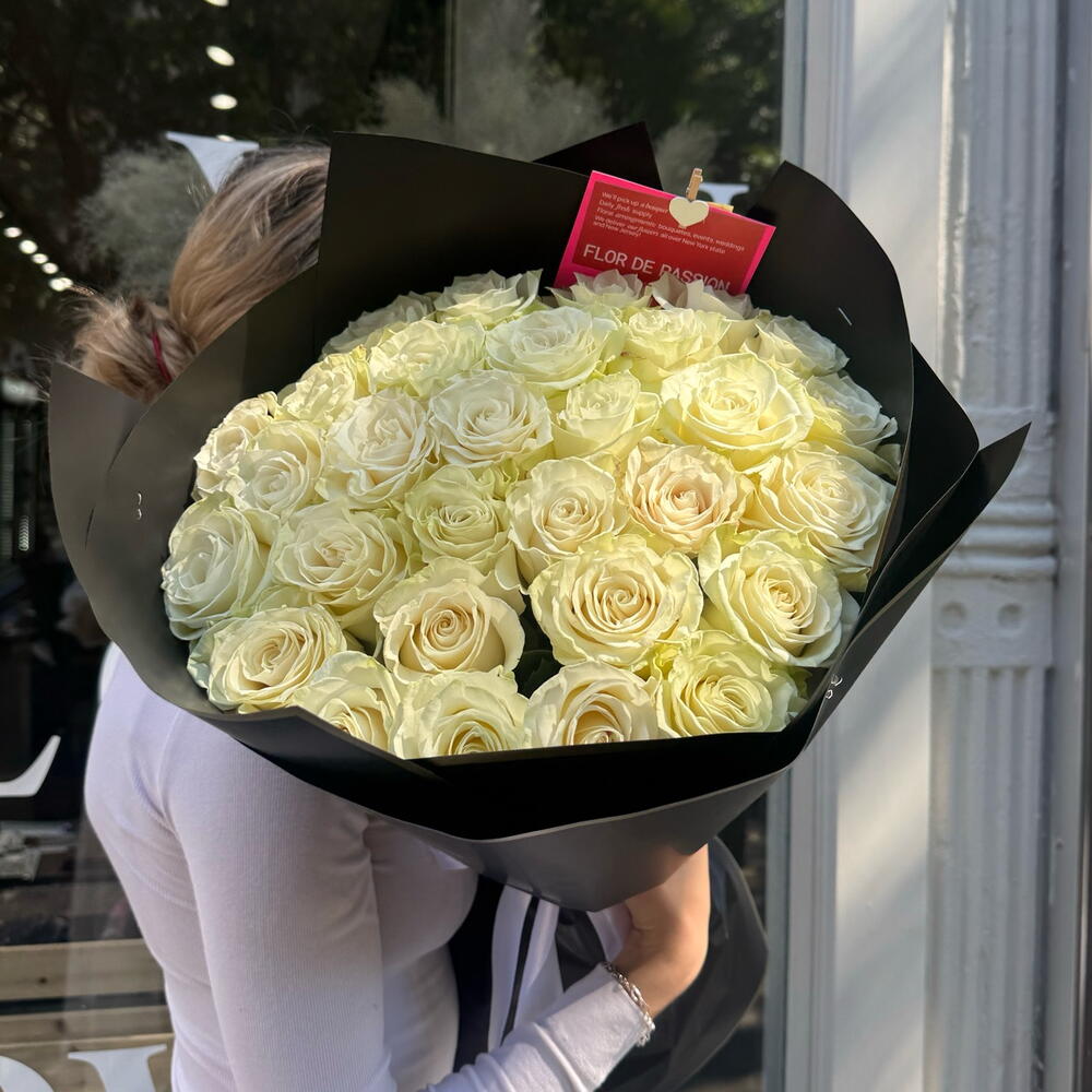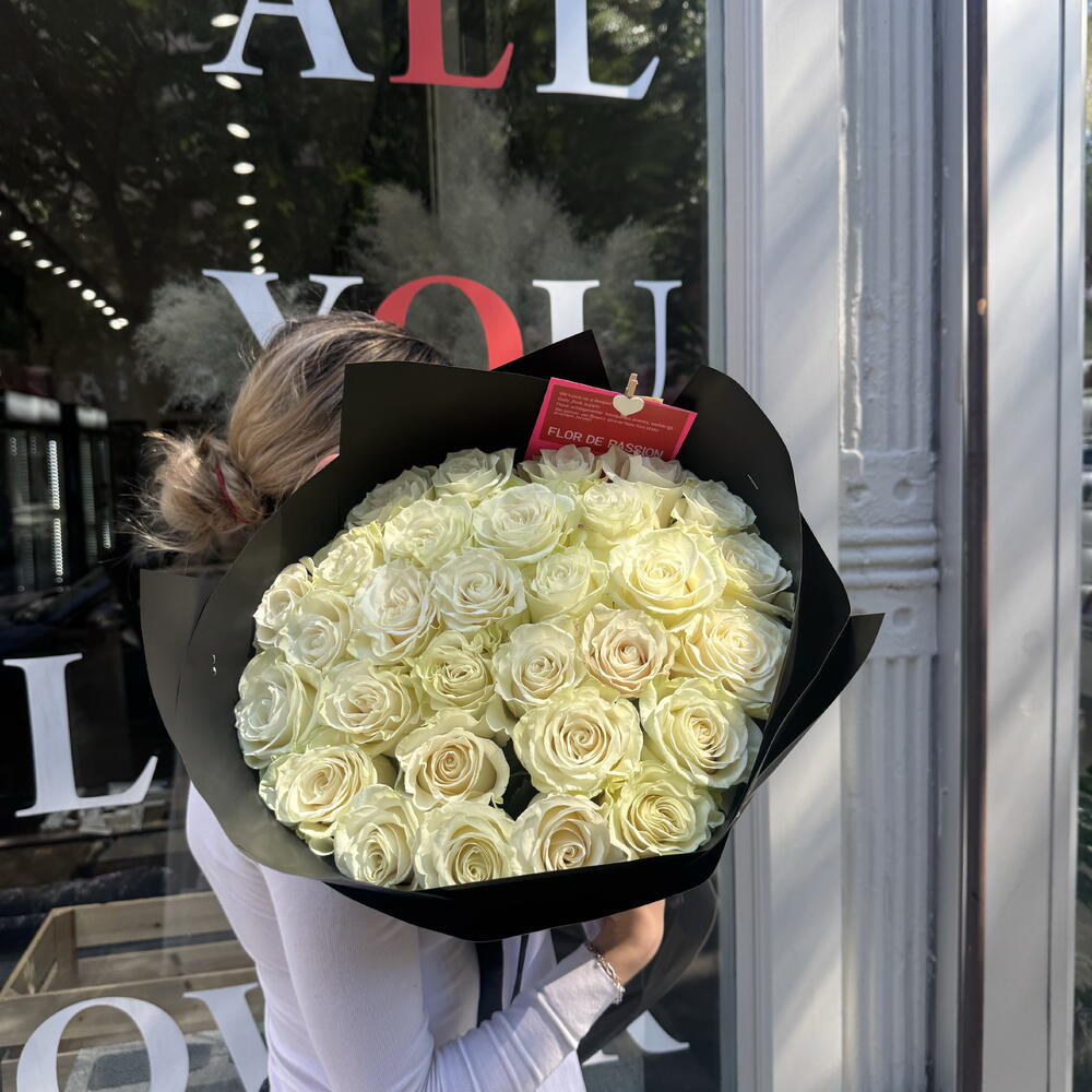 This hand-crafted bouquet features premium long stem white roses that will add elegance to any occasion. With its long-lasting blooms and delicate fragrance, this bouquet is perfect for weddings, anniversaries, or any special event. Elevate your floral arrangements with our Mono White Roses Bouquet. HOW TO CARE OF FLOWERS? Do not remove the wrapping paper from the bouquet, so then flowers will live longer Change the cold water in a vase every day Keep the vase clean Cut the stem of each flower every two days Keep the bouquet out of a direct sun, drafts and heaters Add the flower food 2-3 days after you’ve bought your bouquet (We add the flower food to every bouquet)