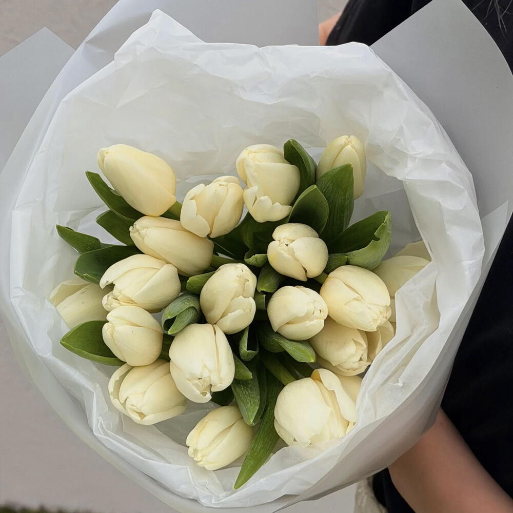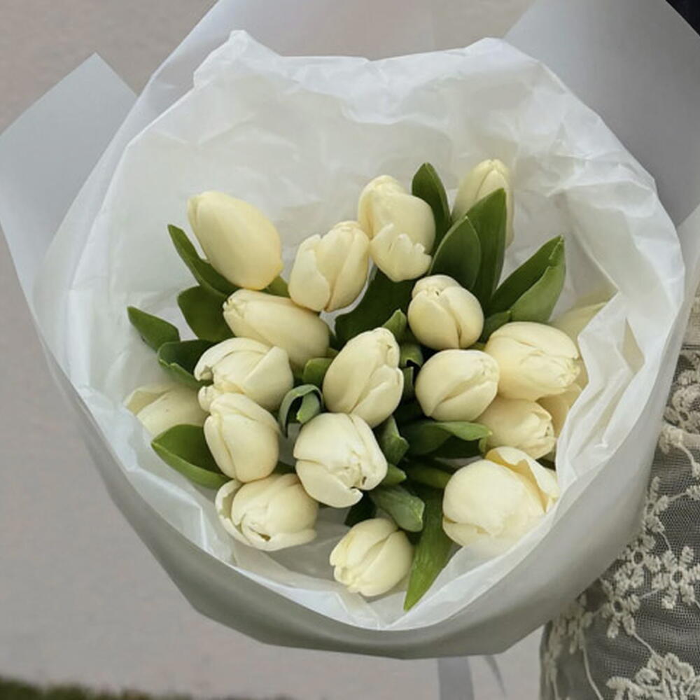 The photo shows a bouquet of 20 White Tulips. 30 White Tulips — timeless, clean, and effortlessly elegant. Fresh blooms, beautifully wrapped, and ready to impress. Perfect for a romantic gesture, a heartfelt thank you, or simply brightening someone’s day. 🤍 The actual bouquet may slightly vary from the photo. Colors, shades, and the natural shape of the flowers can differ, but the style and quality always stay the same.