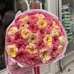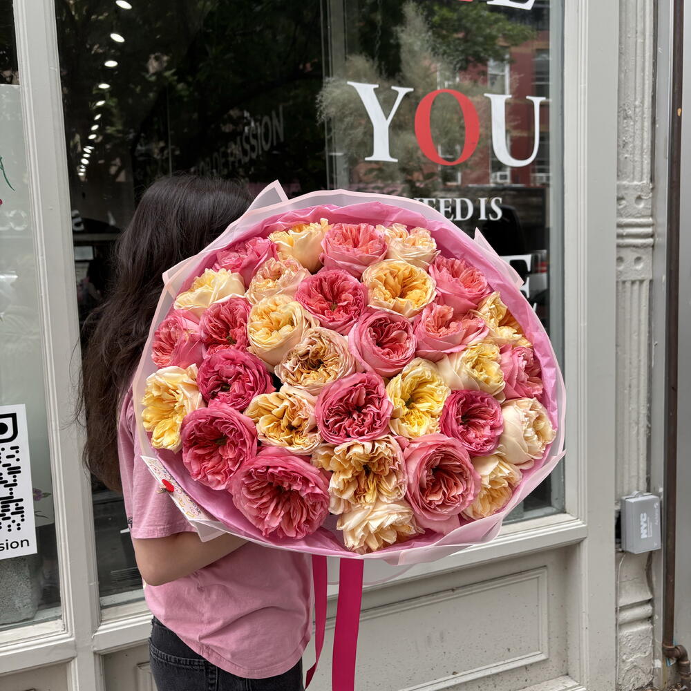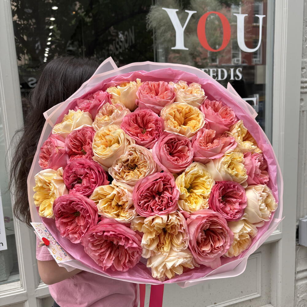 A lush, eye-catching composition of dusty pink and peach shades is the embodiment of exquisite luxury. The undisputed star of this gorgeous bouquet is the garden rose Pink Expression. Its exquisite complex shade and volume will not leave even the most sophisticated connoisseur indifferent. A bouquet of roses will suit a lady with exquisite taste who knows exactly what she wants.